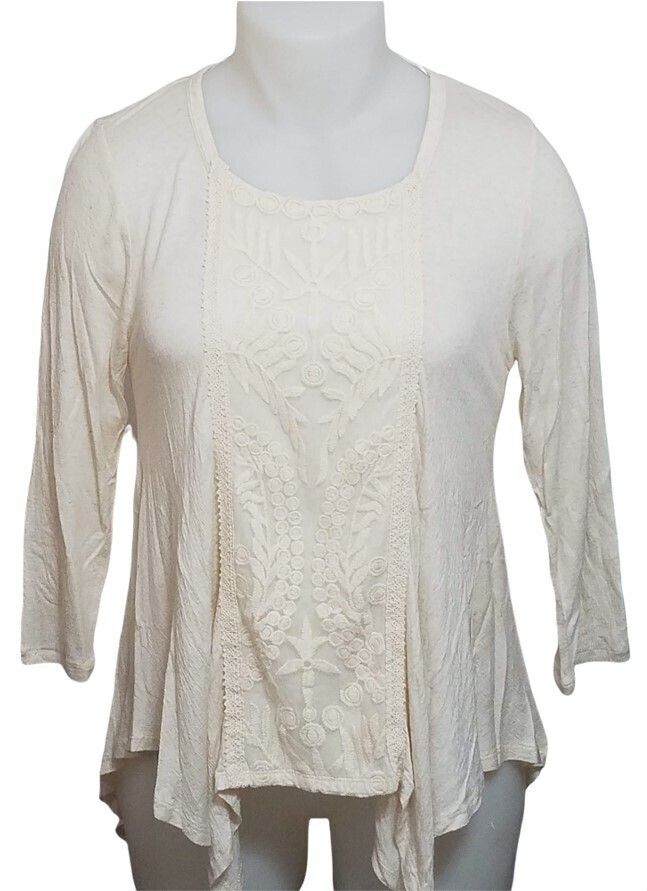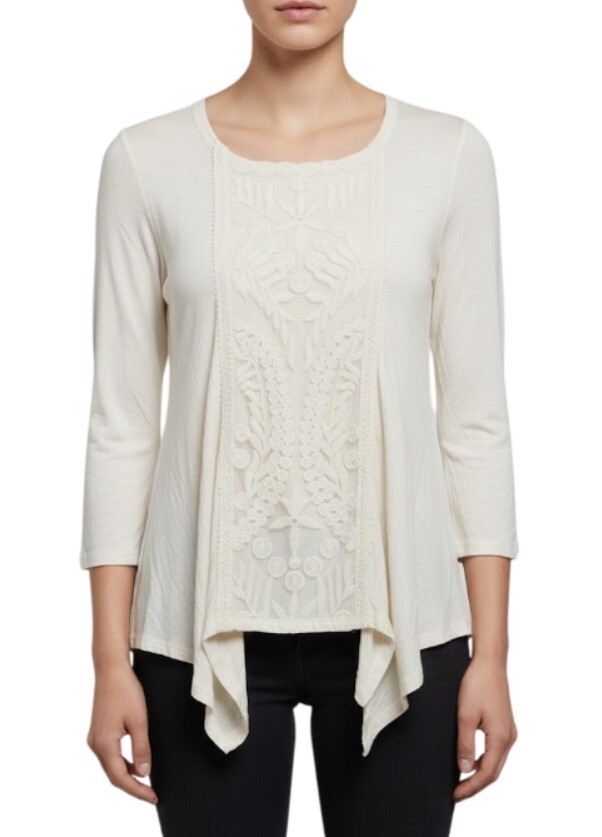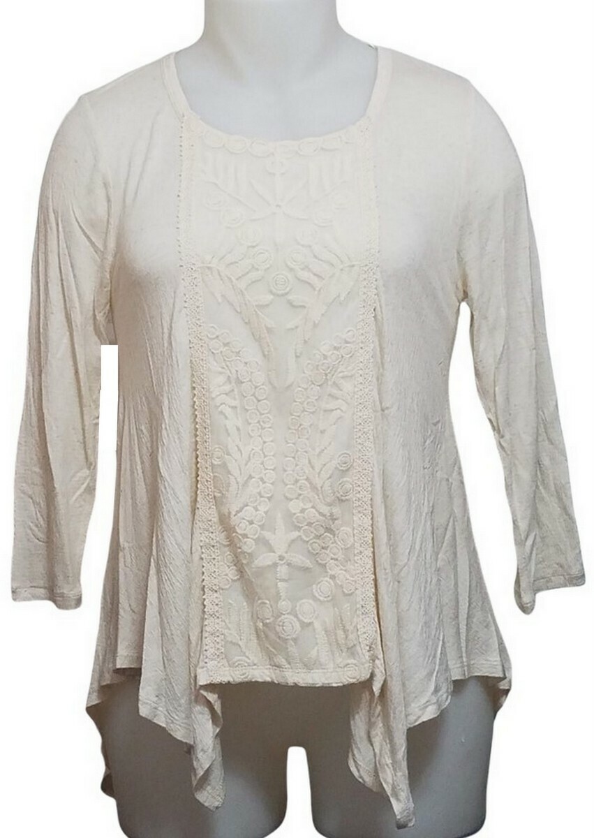 This Style Co. blouse is a must-have addition to any wardrobe. The ivory lace material is delicate and beautiful, with intricate lace accents adding a touch of elegance. The handkerchief hem and lace inset make it a unique and stylish piece, perfect for casual occasions.