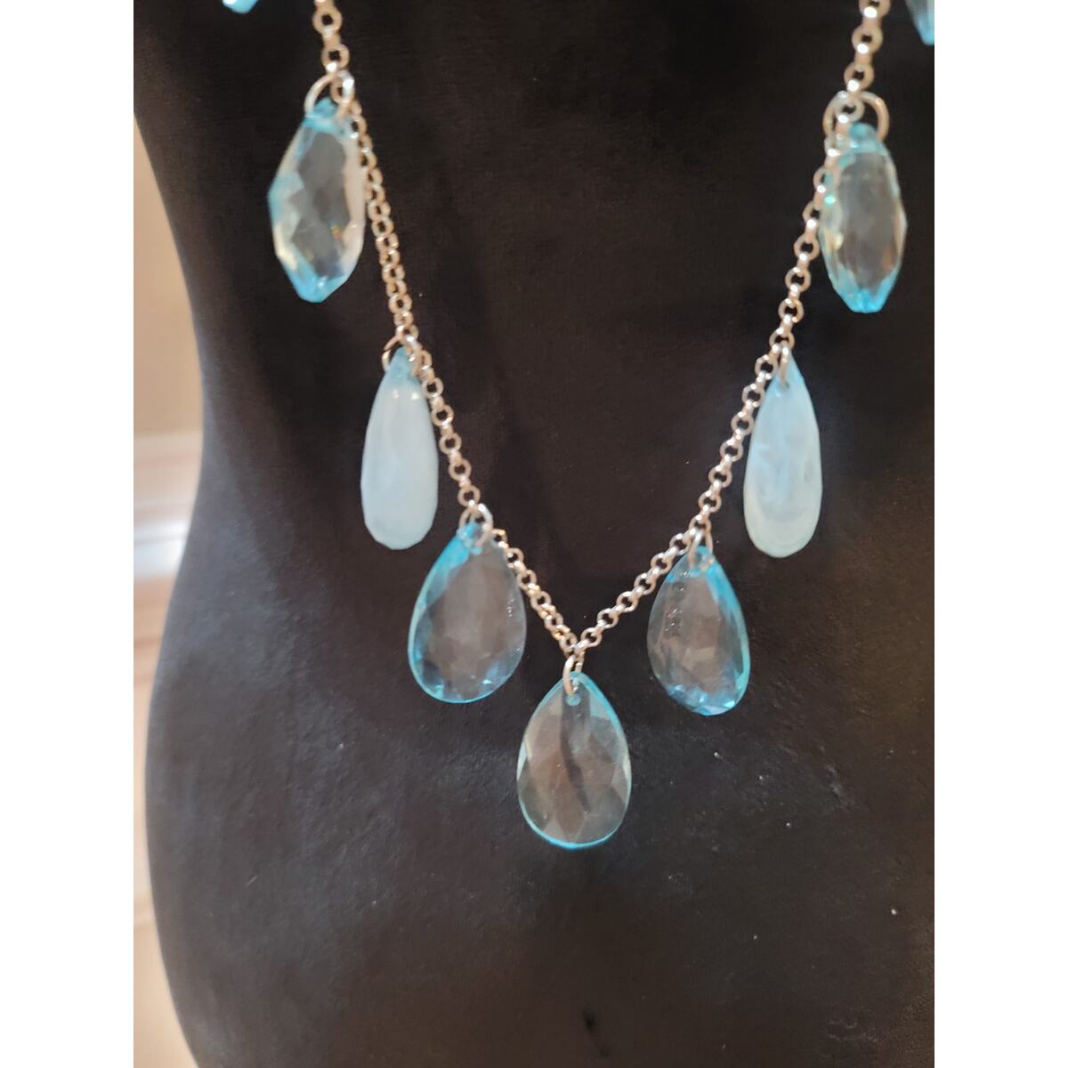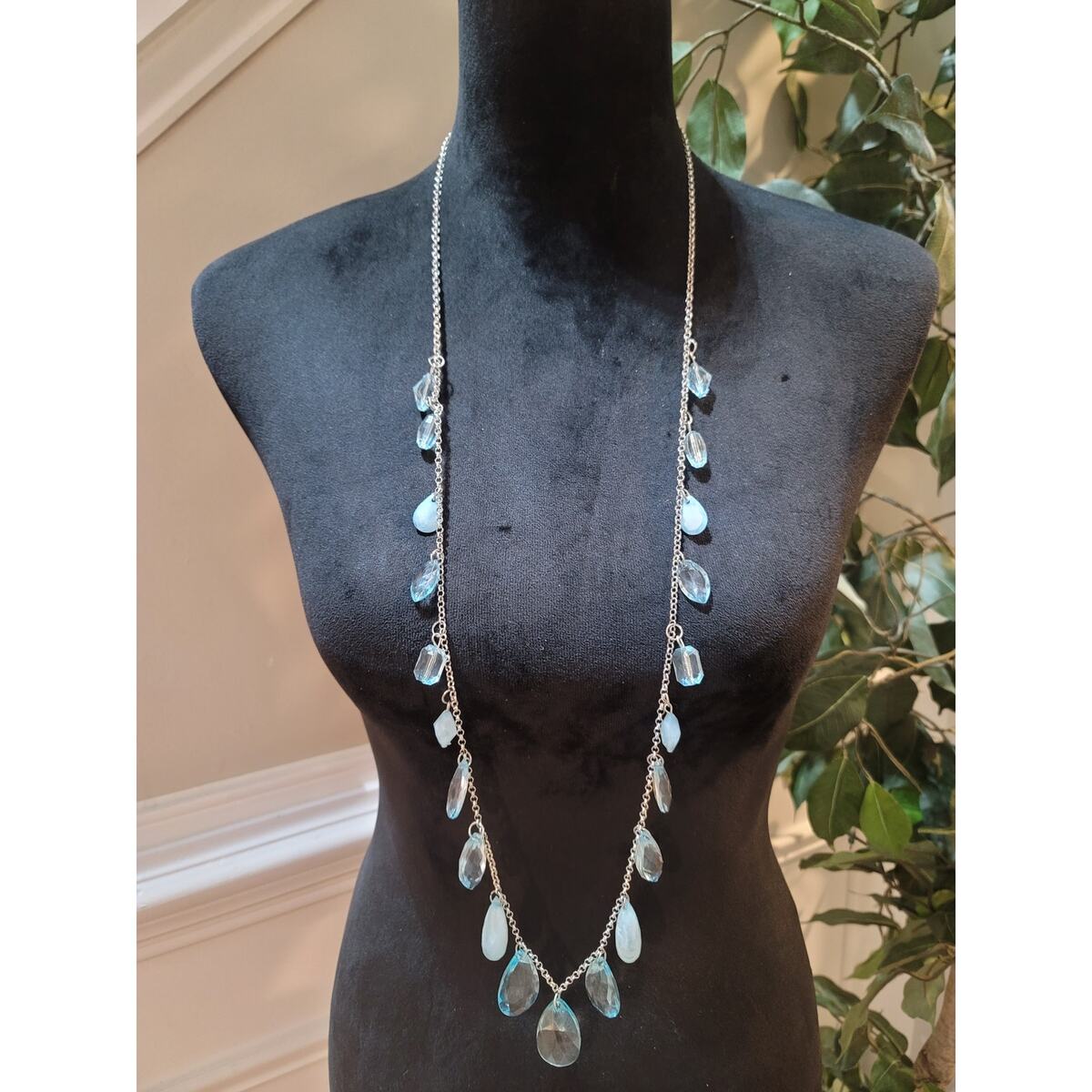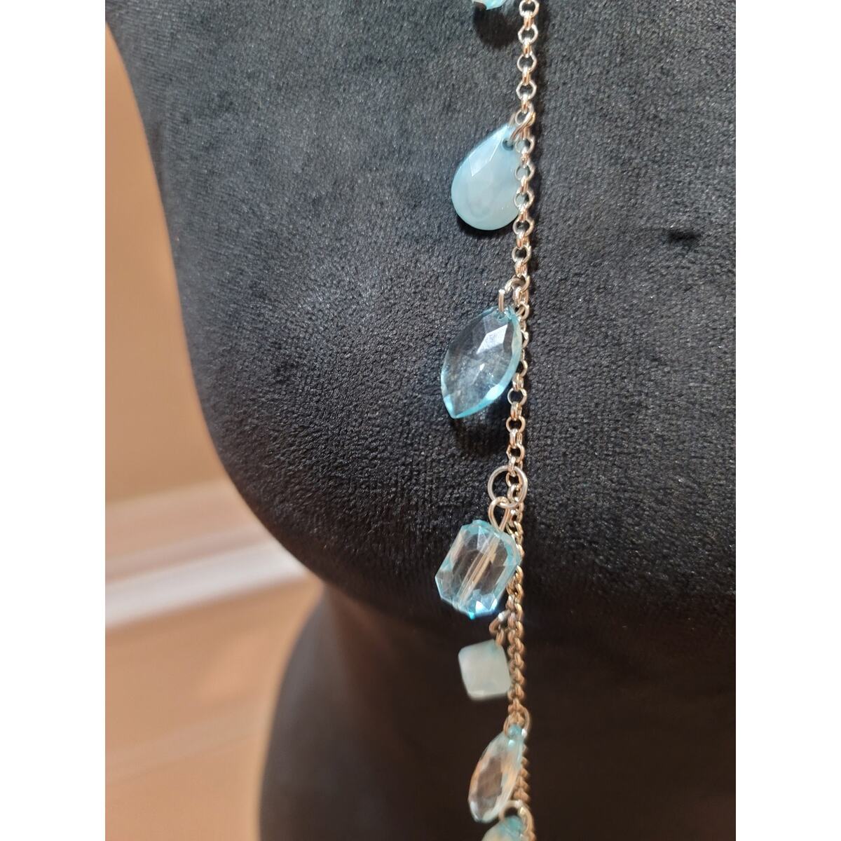 Womens Long Silver Chain Necklace With Blue Teardrop Crystal Charms Lobster Lock