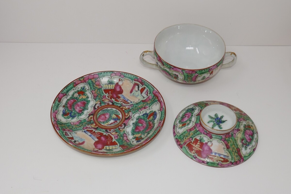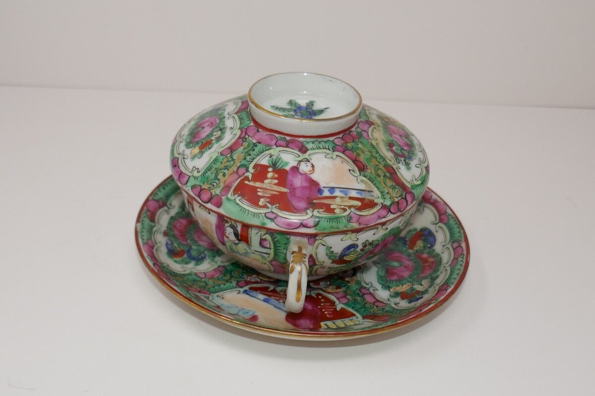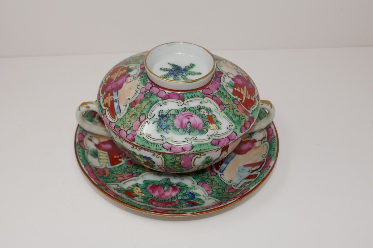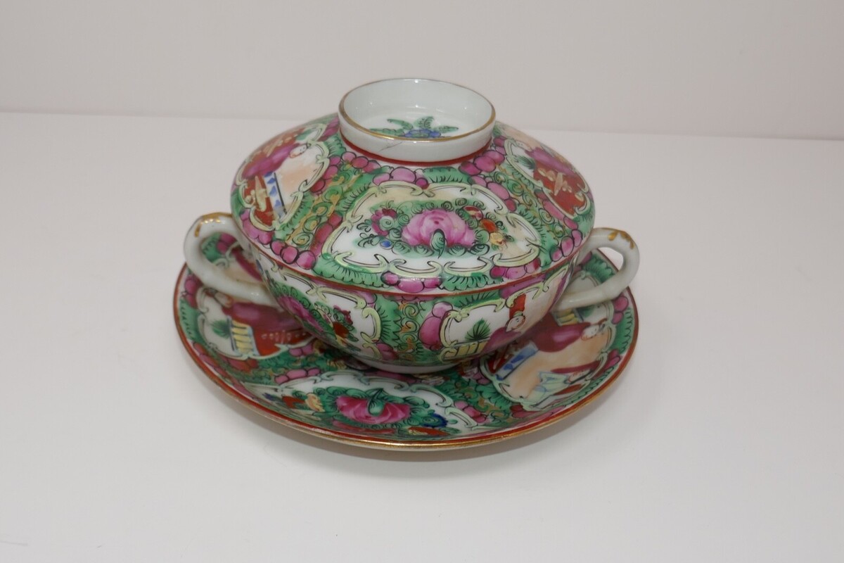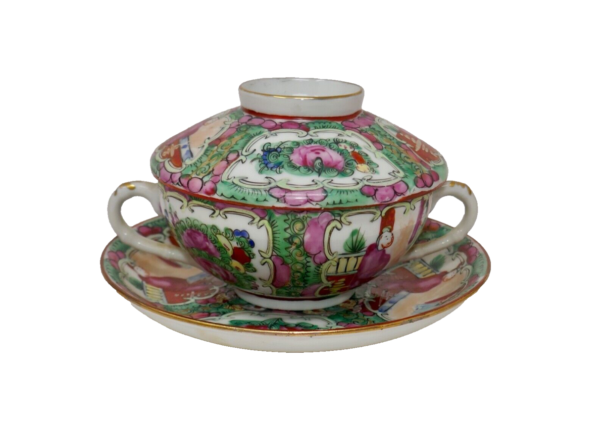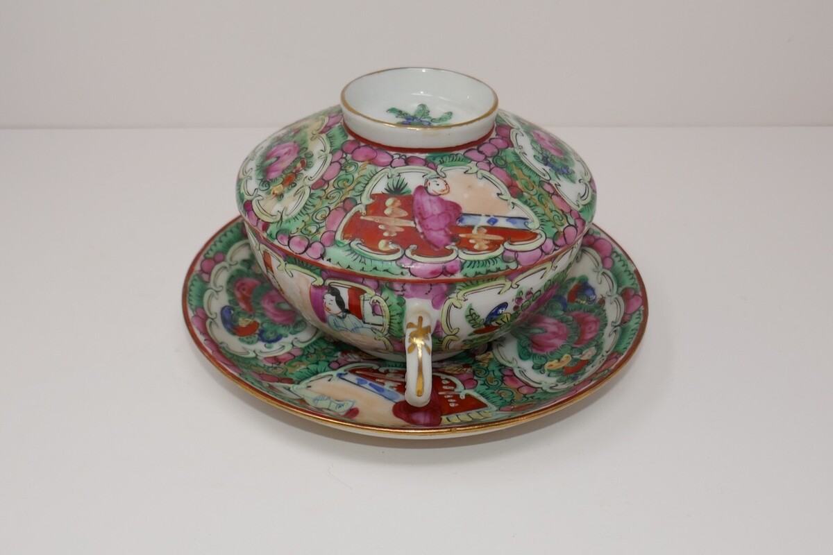 Chinese Famille Porcelain Bouillon Soup Cup with Cover and Under Plate