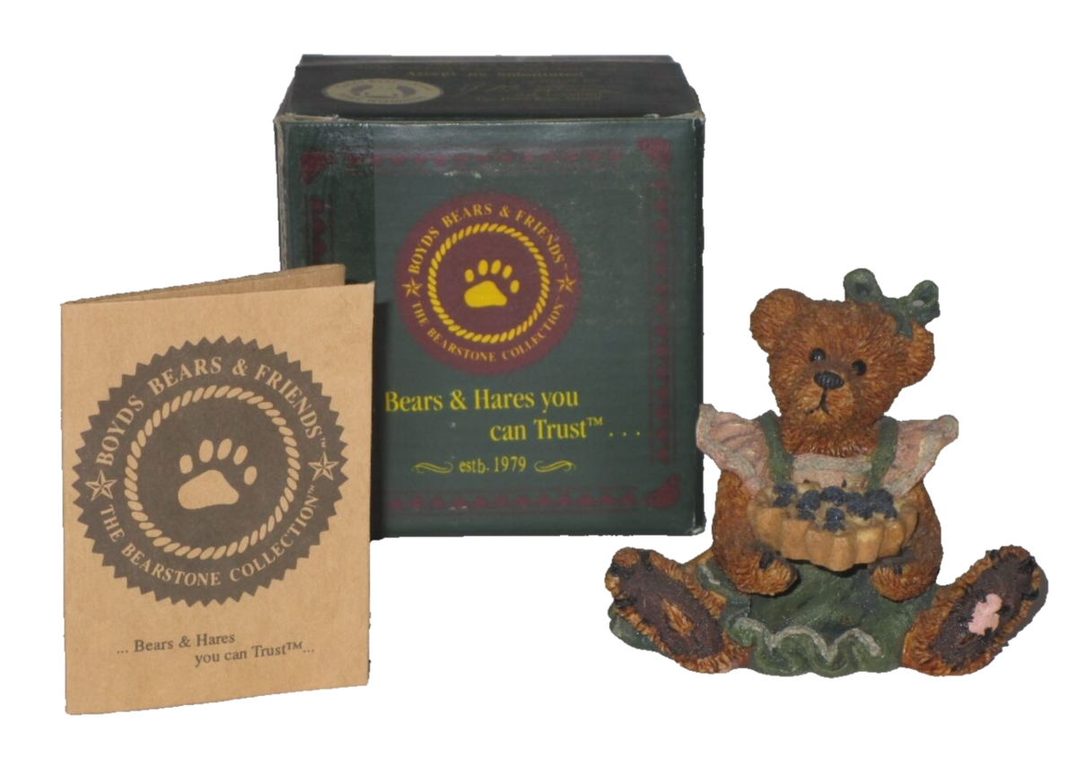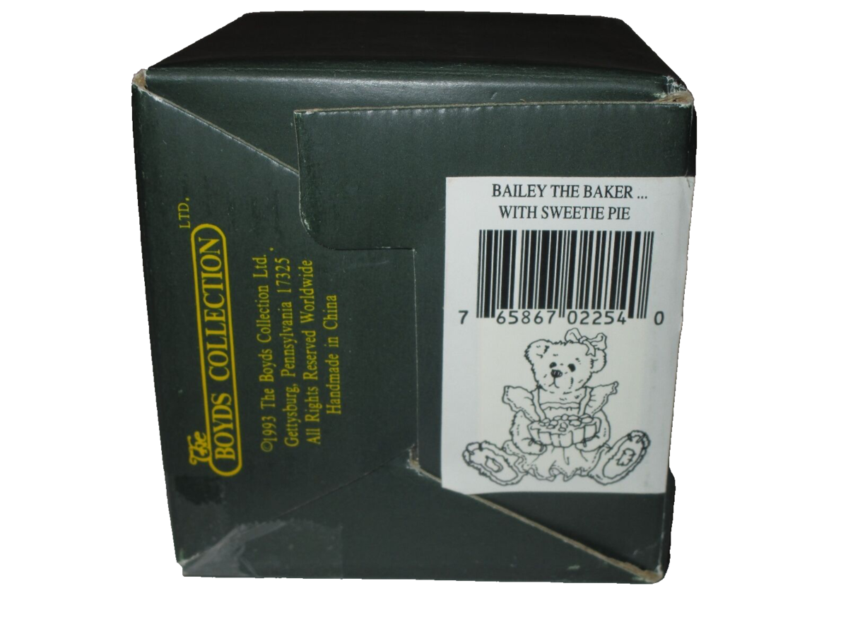 Up for sale is a Boyds Bear figurine titled Bailey the Baker?with Sweetie Pie from the the Bearstone Collection. This measures approx. 2 3/4" tall. Comes in the original box which has a little wear and the Certificate of Authenticity.