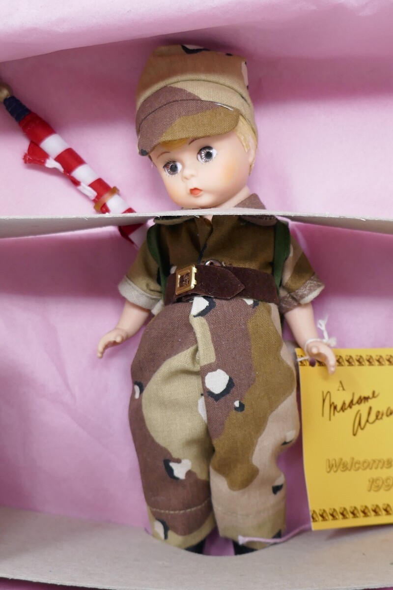 Up for sale is a Madame Alexander Welcome Home Desert Storm Military Doll. This measures approx. 8" tall and still attached to the box which has little wear.