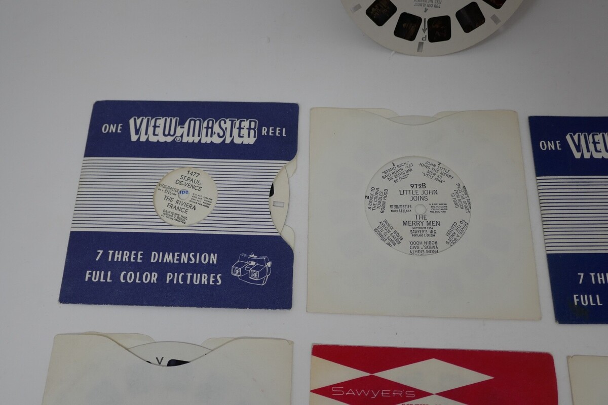 Up for sale is a Sawyer Viewmaster 3-D Viewer Reels Lot. This includes 6 reels of various places and Little John John The Merry Men. Has little wear.