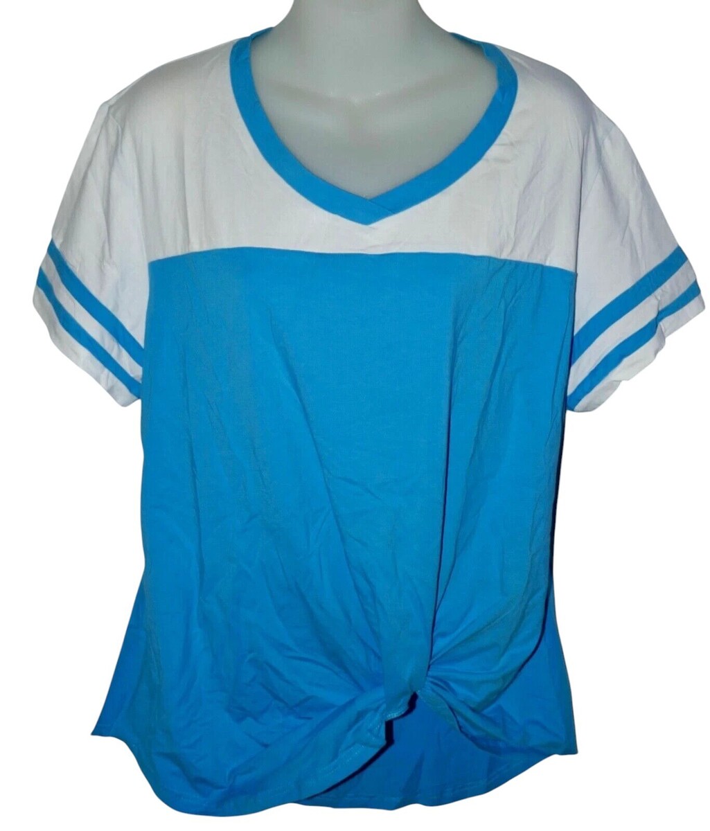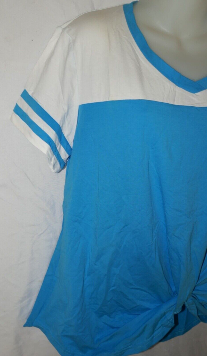 This women's casual T-shirt features a V-neckline and short sleeves with a twist knot accent. Purchased and removed tags but did not fit. Measures approx. 22" from pit to pit with 7" sleeves and 30" long.
