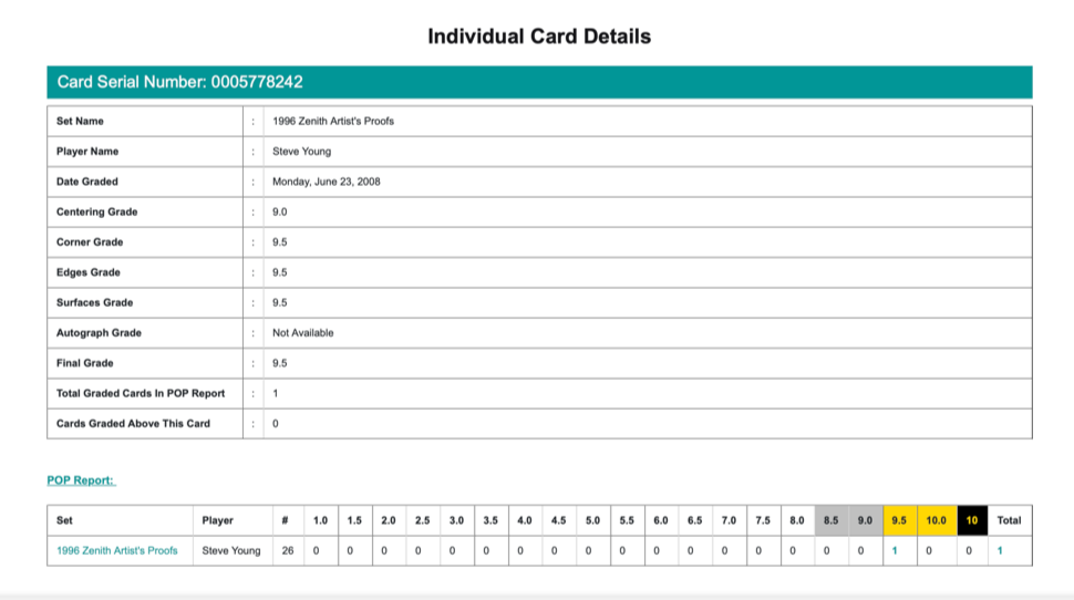 1996 Zenith Artist's Proofs #26 Steve Young Beckett 9.5 GEM MINT 1/1 POP