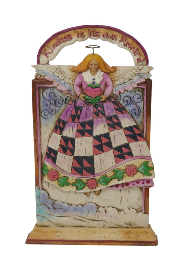 The Enesco 2002 Jim Shore Heartwood Creek Kindness Is Its Own Reward Wall Plaque is a medium-sized traditional style plaque featuring a raised relief design. Made of resin, this multicolor plaque measures approx. 9.25" tall and 5.75" wide.