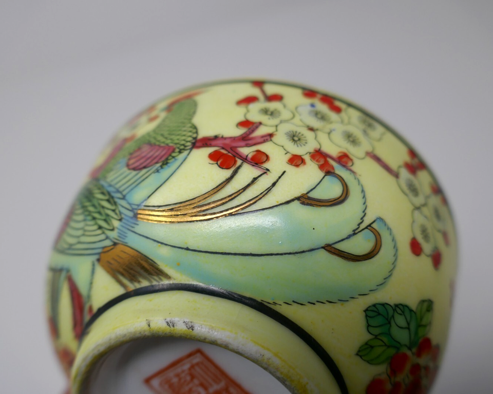 The Qianlong Chinese Famille Rose Porcelain Bowl is a true testament to the artistry of antique Chinese craftsmanship. The bowl features a vibrant, hand-painted bird motif, set against a rich tapestry of multi-colored flowers and foliage. Measuring 2.25 inches in height and 4.5 inches in width, this bowl is a beautiful example of the Porcelain Pottery tradition, with an age that is shrouded in mystery. The rim does have a small chip and the side has a small bubble.