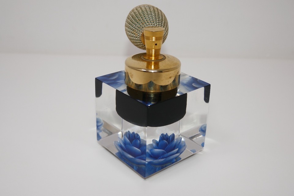 Up for sale is a vintage Evans Atomizer Lucite w/Blue Flower. This is a 2" x 2" cube with few scuffs or scratches from age, inside is a beautiful blue flower.