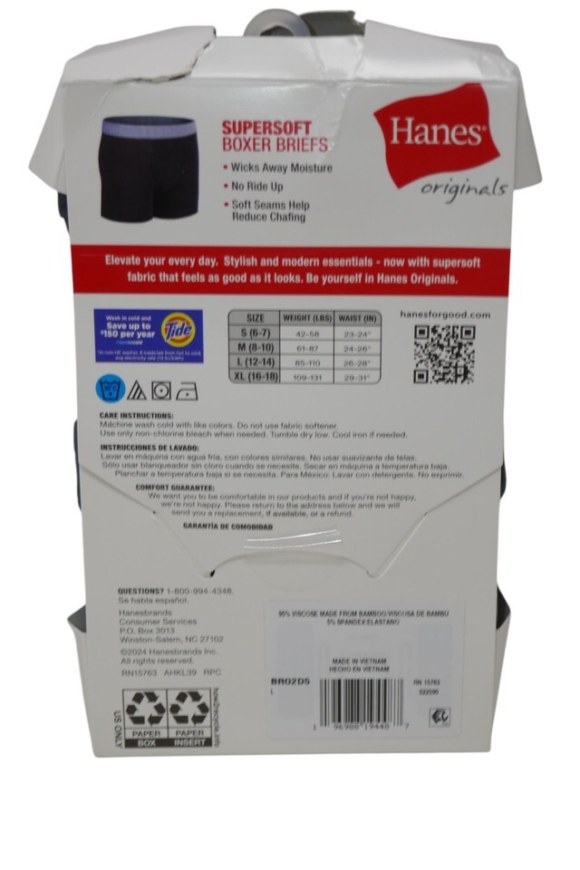 The Hanes Originals Boys' SuperSoft Boxer Brief Assorted Underwear 5-Pack is a set of comfortable and stylish underwear designed specifically for boys. The pack includes five pairs, ensuring that your child has plenty of underwear for the week. With a focus on quality and style, these boxer briefs are a great addition to any young boy's wardrobe. The packaging has wear.
