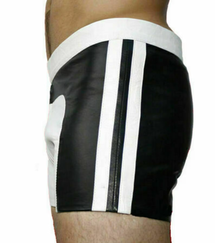 Black & White 100%Men Gym Short Leather Pants Boxer Genuine Lambskin Sports