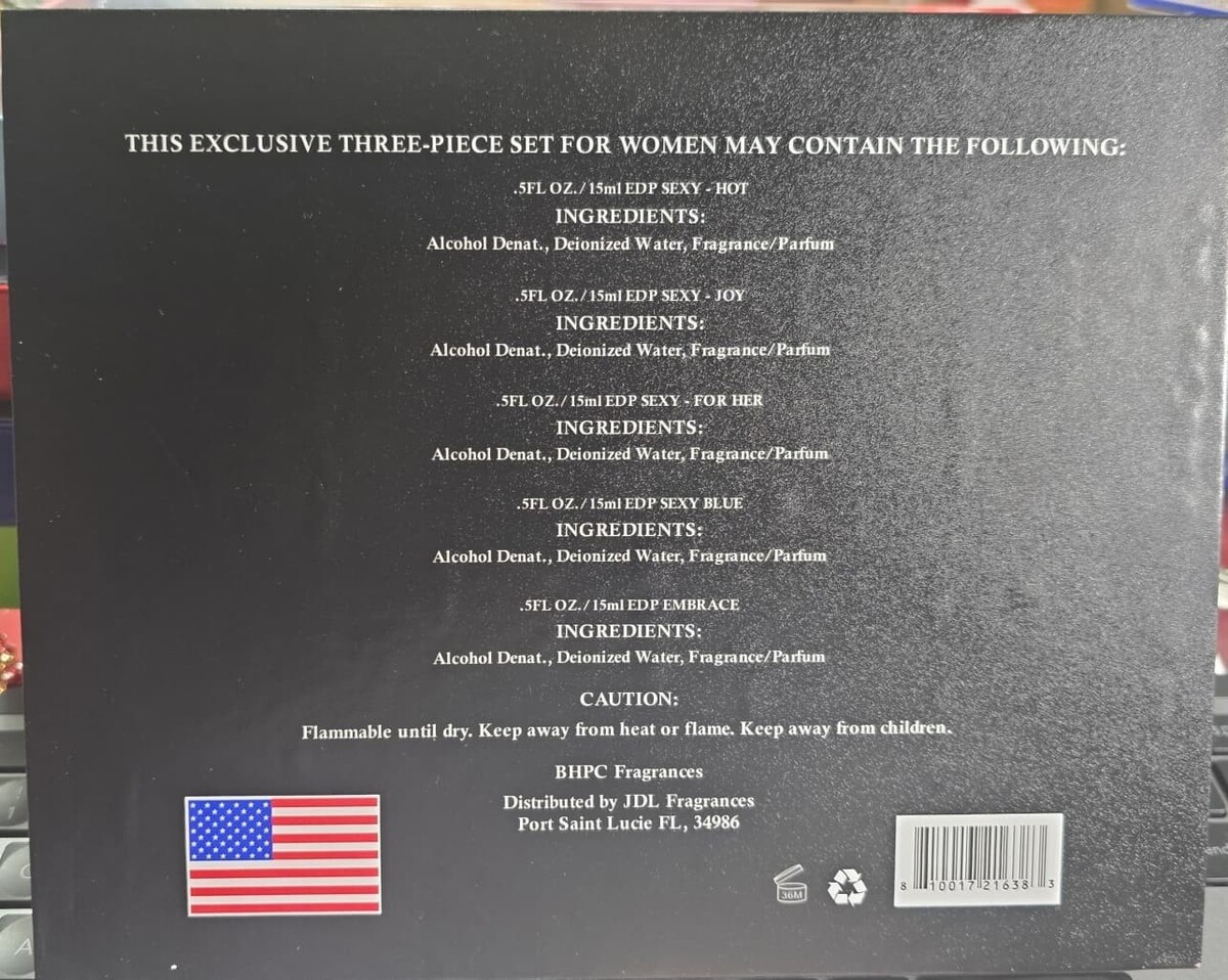 Elegant 3-Piece Perfume Gift Set ? This beautifully packaged set includes three 0.5 fl oz Eau de Parfum sprays in distinct and captivating scents: Sexy Blue, Embrace, Hot for her. Each fragrance offers a unique mood and personality, perfect for every occasion.