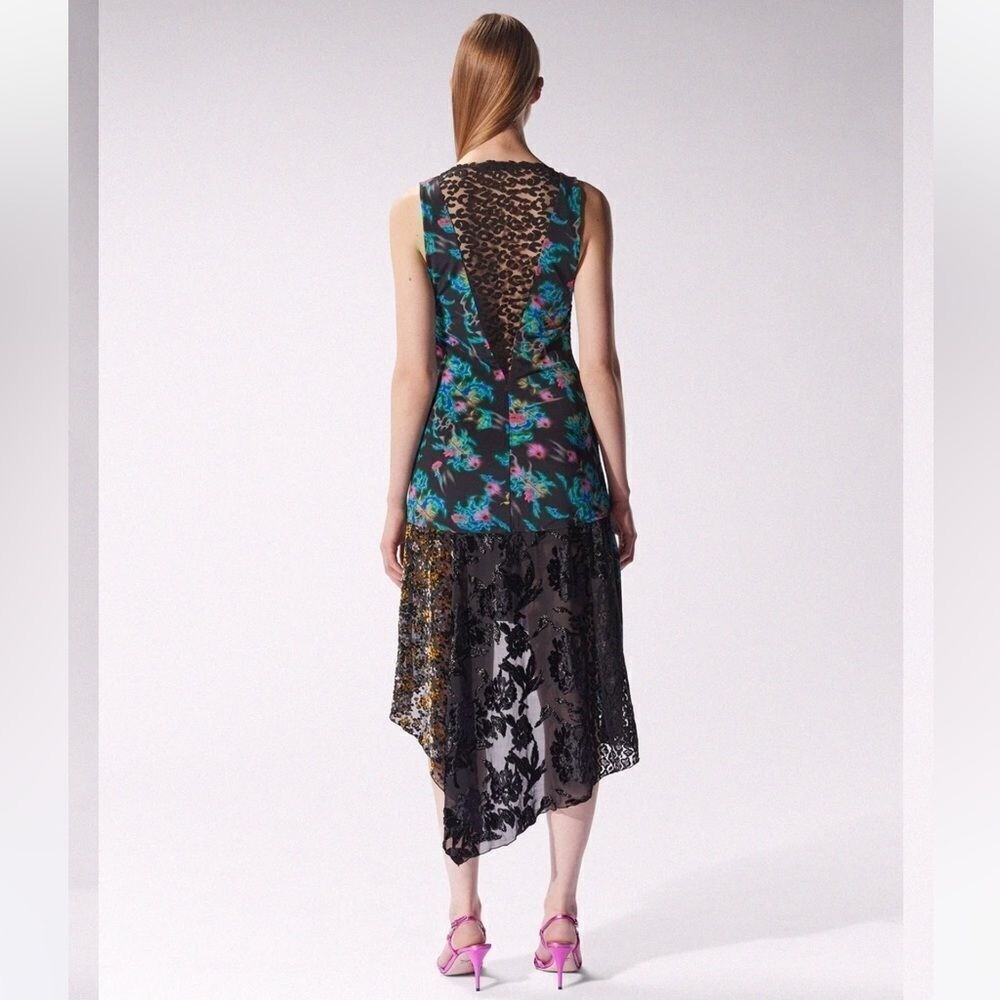 An off-kilter hemline trimmed with flocked tulle panels brings an edgy element to this plunge-neck sleeveless dress in the label's holographic floral print.