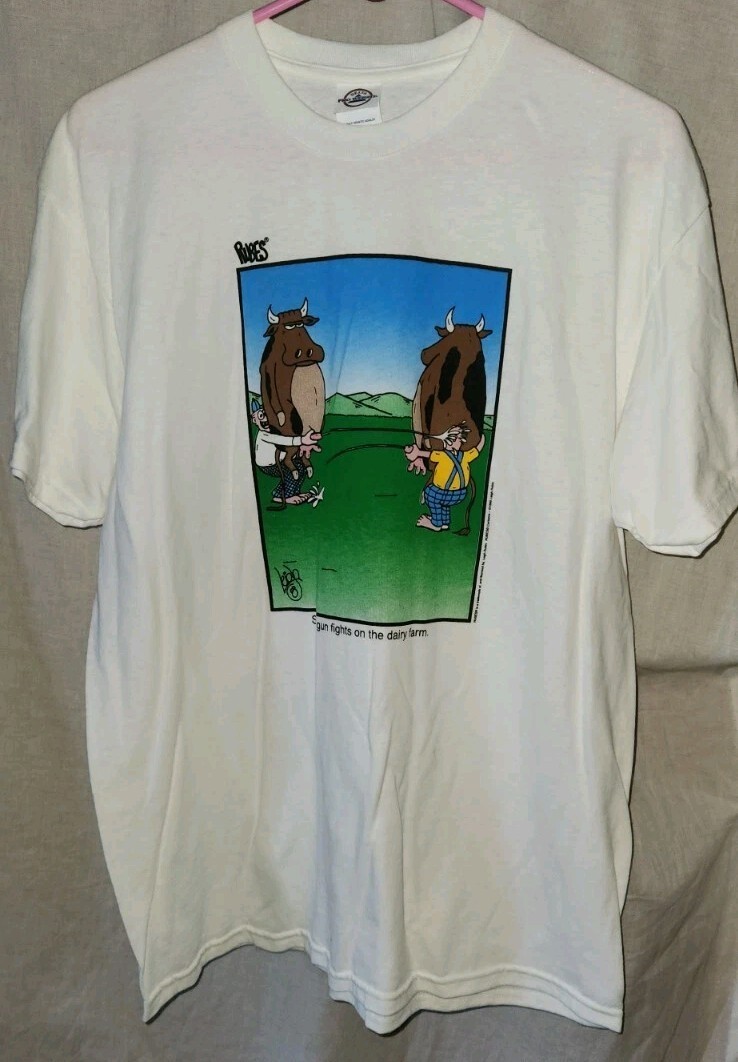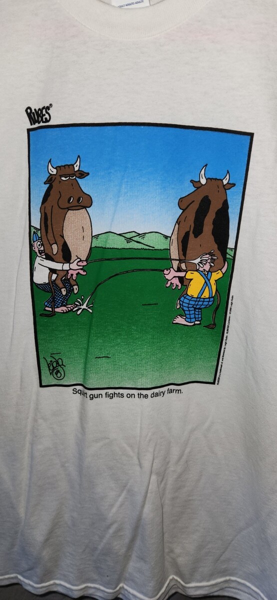 VTG Rubes Delta Pro Weight Large T-Shirt Squirt Gun Fights On The Dairy Farm