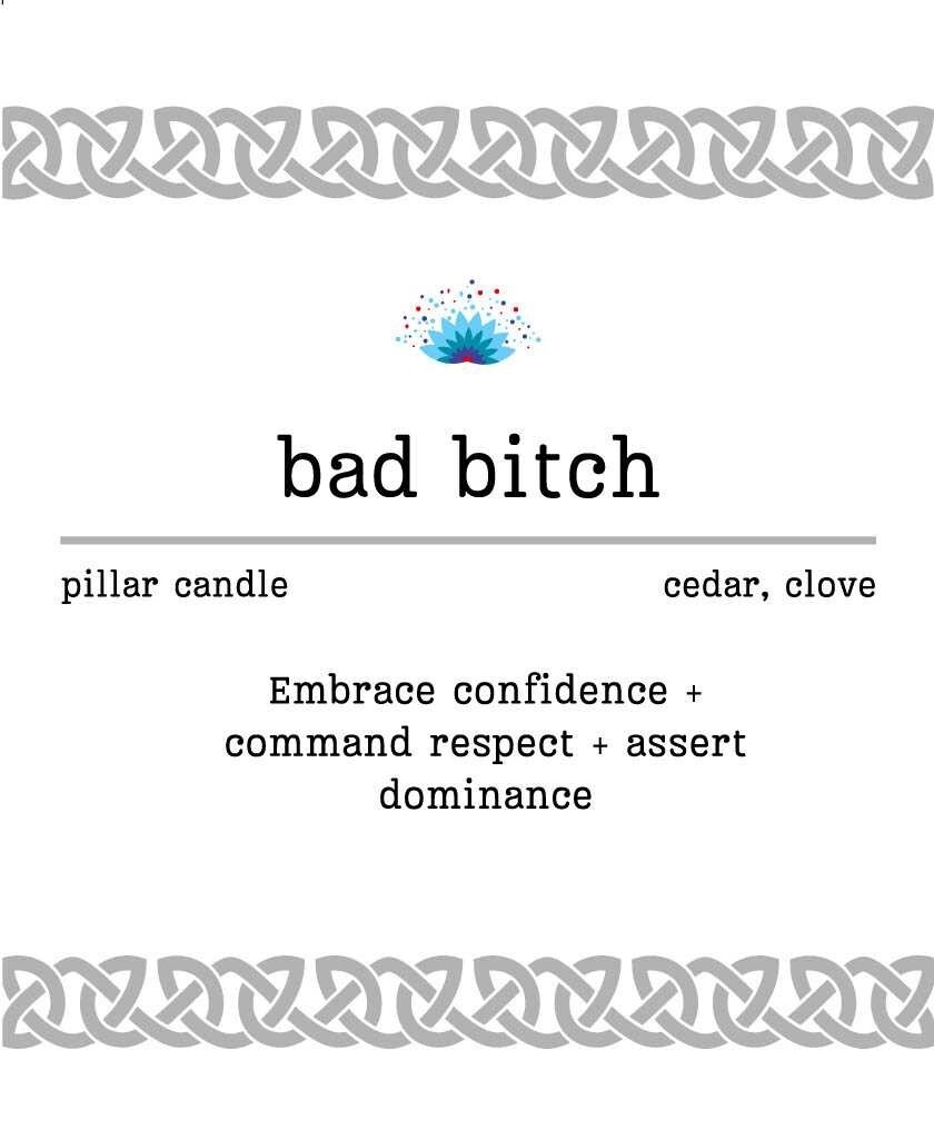 Manifest confidence, empowerment, and self-love with the Manifestation Pillar Candle ? Bad Bitch. Crafted with care and infused with essential oils, this scented candle is designed to boost your personal power and intention work.