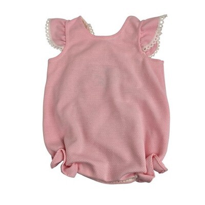 Keywords: baby girl, pink romper, embroidered flower, bubble romper, ruffle sleeves, lace trim, vintage baby, sweet, adorable, summer outfit, playwear, baby shower gift, smocked, cross stitch, retro, VTG, cottagecore, girly