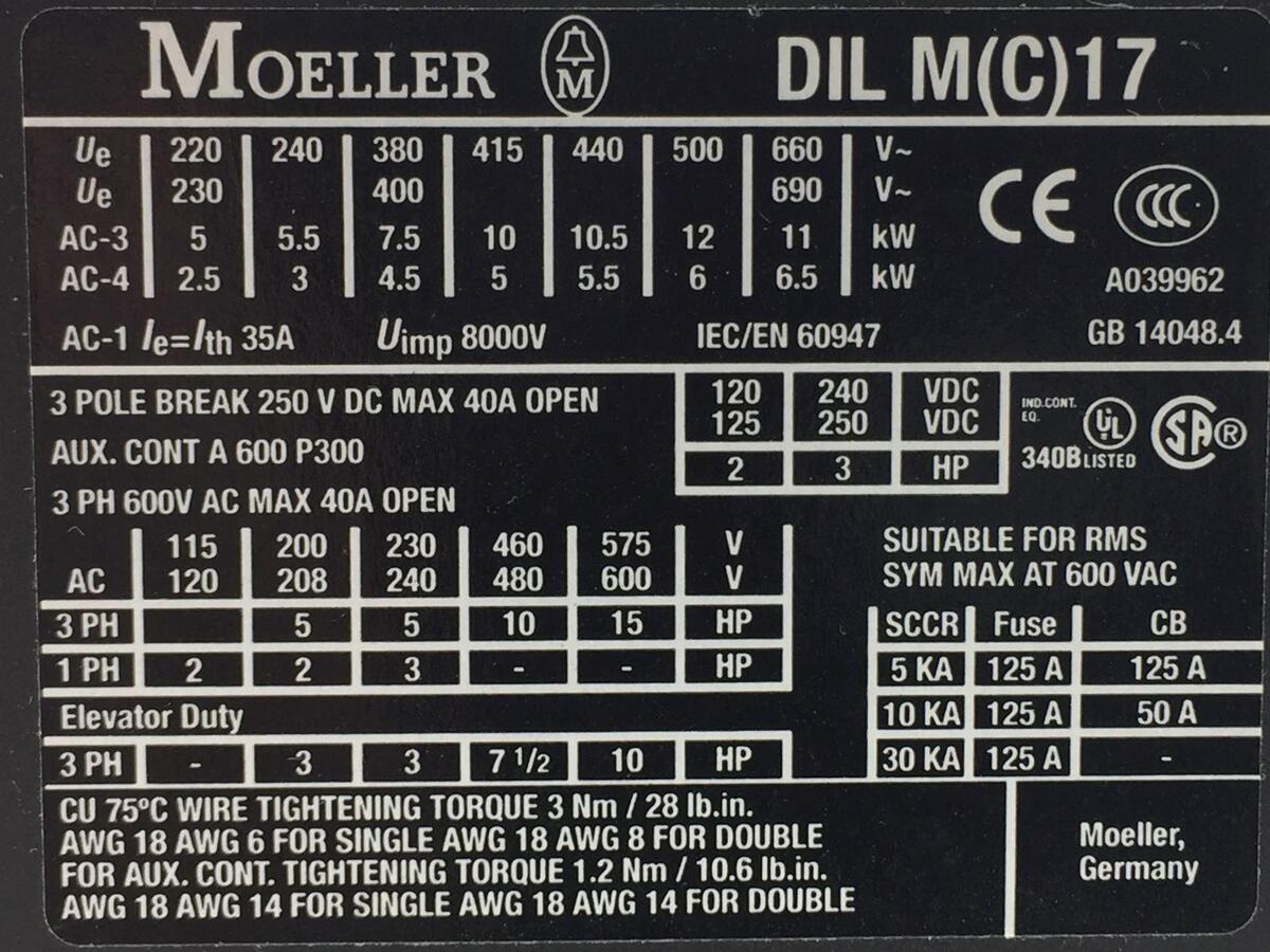 Moeller DILM17-10-24VDC xStart Contactor, 460V 18A 24-27VDC Coil