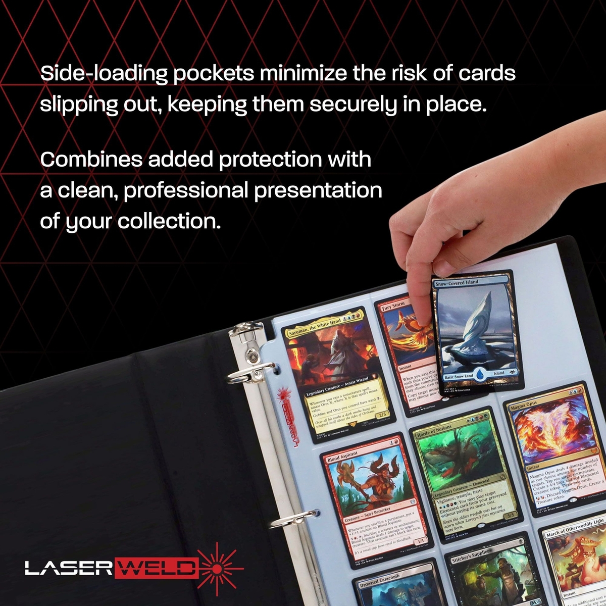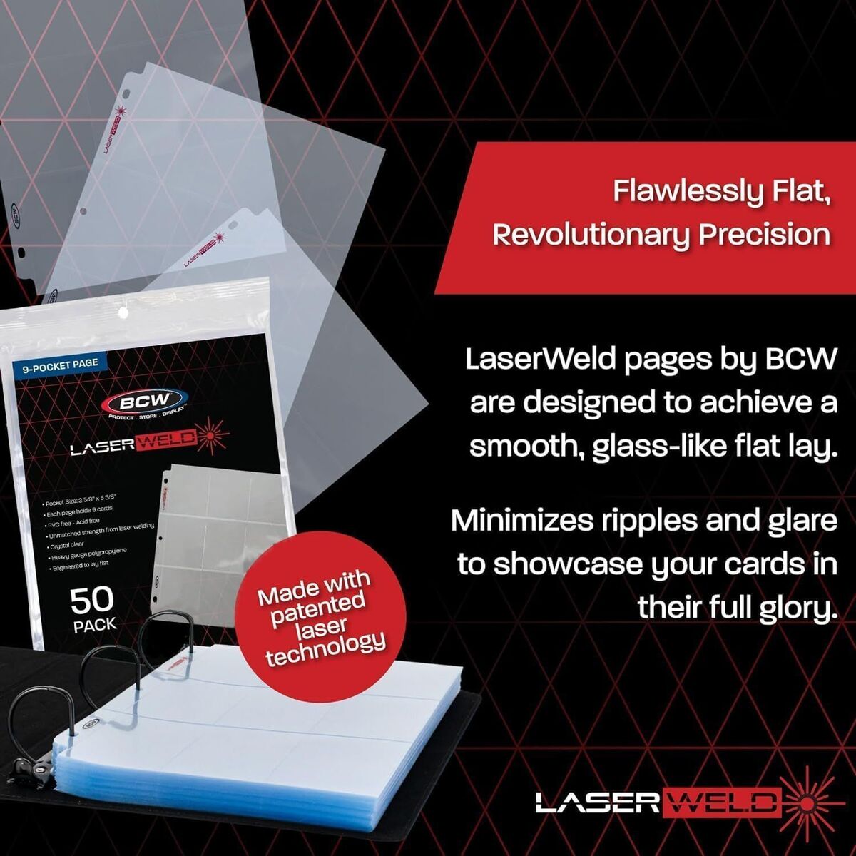Our LaserWeld pages are a premium product that are head and shoulders above any other poly pages available on the market today. As the name suggests, these pages are manufactured using our patented laser-welding process. This gives a finer weld line compared to standard hot press or sonic welding while also being stronger. Thinner lines also puts more focus on your cards, making them aesthetically superior as well. LaserWeld pages sit flat and smooth. Other methods can make the material wavy or curved. This helps to minimize glare and pillowing, making displays and photos more attractive. The unique side-loading design allows for easy insertion and removal of cards, enhancing both the protection and presentation of your collection. The flatness of the pages will also let you fit more in a 3-ring binder or album. This allows you to use smaller binders to hold your collection, or let larger ones hold even more!