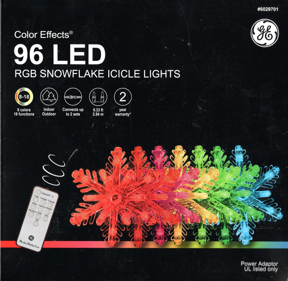 GE COLOR EFFECTS 6029701 96CT RGB SNOWFLAKE LIGHTS 9' 8-COLOR 18-FUNCTION - NEW!
