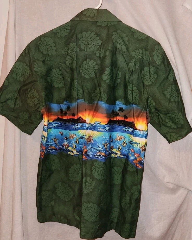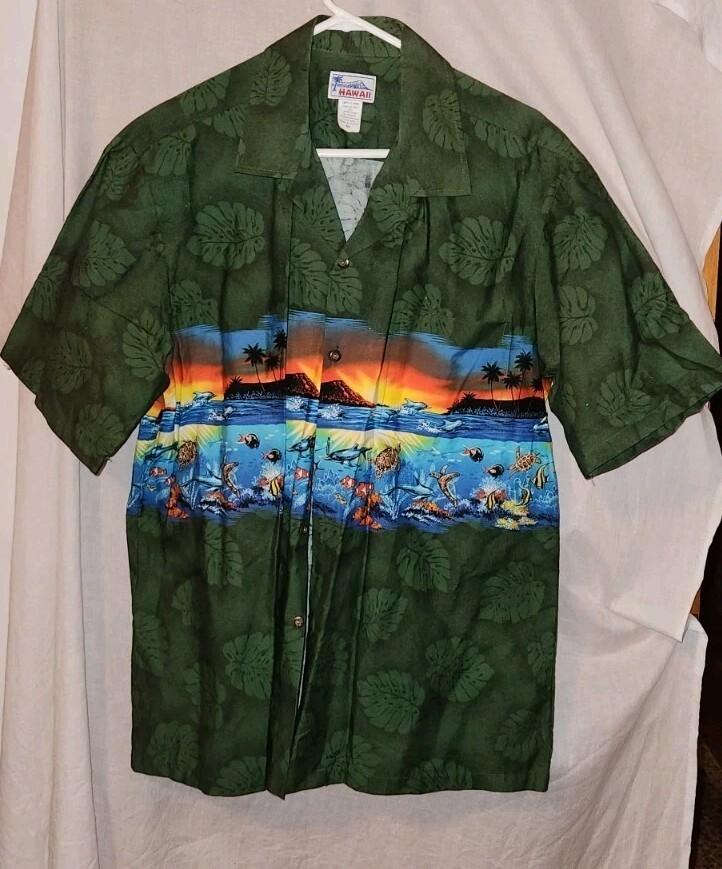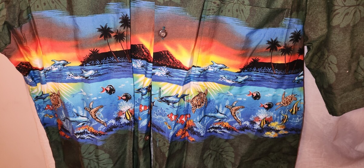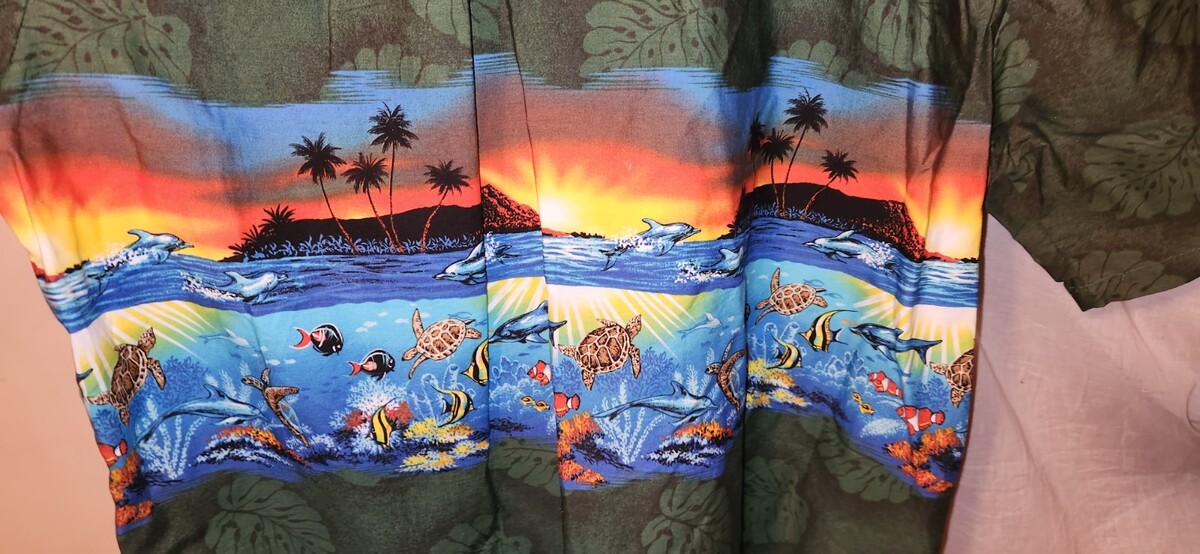 Vintage Hawaii 100% Cotton Button Front Mens Shirt Sunset Sea Life Dolphins XL