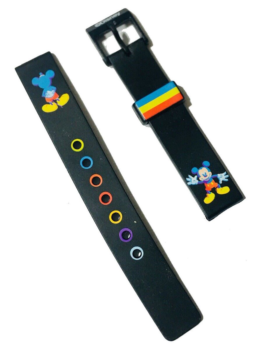 Esto es para una nueva banda de reloj de reemplazo de goma negra de Disney "Mickey Mouse Tri-Color" Viene con alfileres cargados de primavera (no en im ¡genes) Nuevo en caja