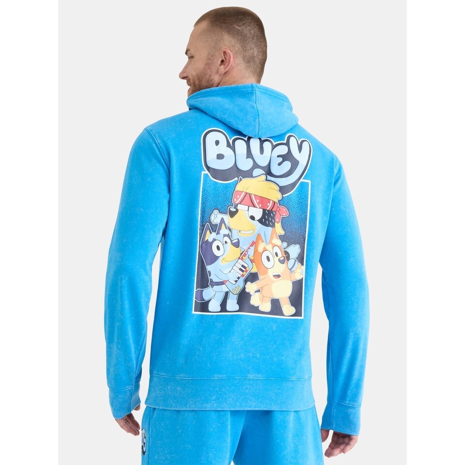 Bluey Men's Front Back Graphic Hoodie, Blue Mineral Wash Size XS (30-32)