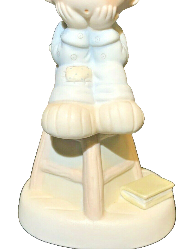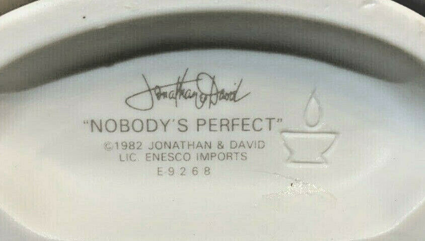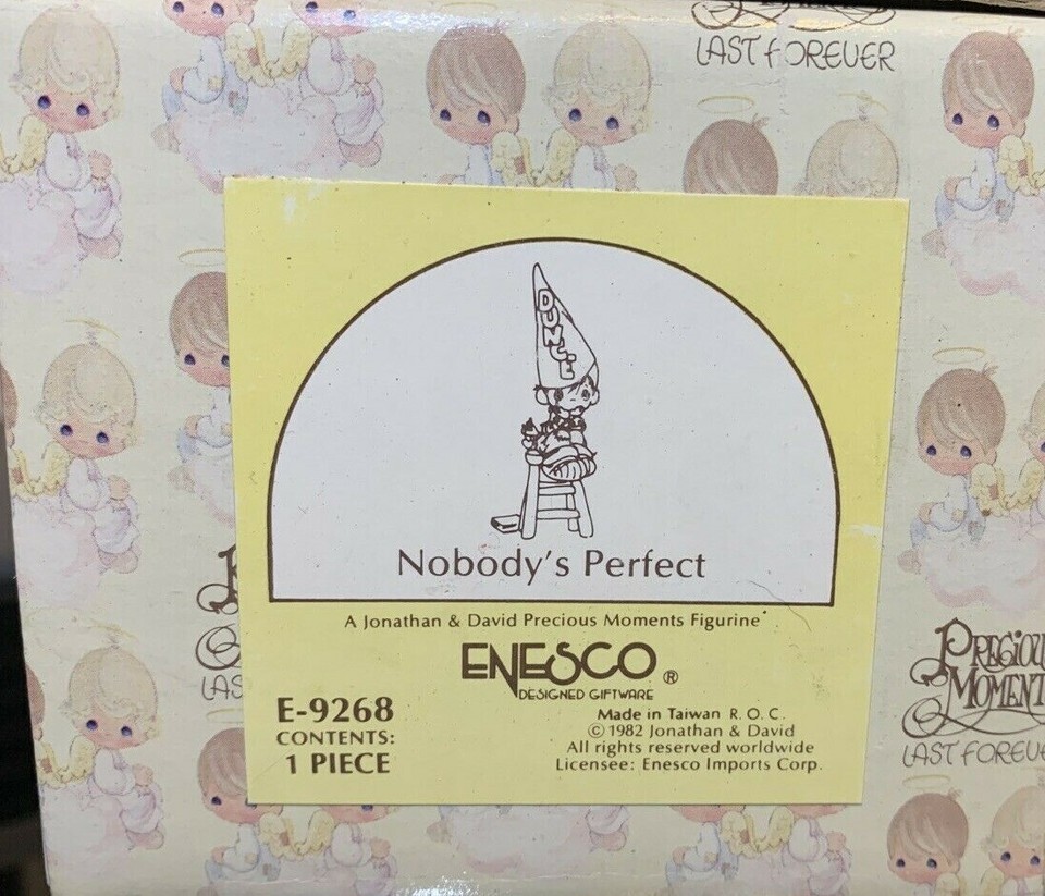 Add a touch of whimsy to your collection with this original 1992 Precious Moments figurine, titled "Nobody's Perfect" and featuring the Flame mark. The small, multicolored figurine depicts a girl holding a sign that reads "Nobody's Perfect" with a cute and endearing expression. This original piece is from the Precious Moments collection and is perfect for all occasions. The finish is matte and the figurine is in great condition, ready to add to your decorative collectibles.