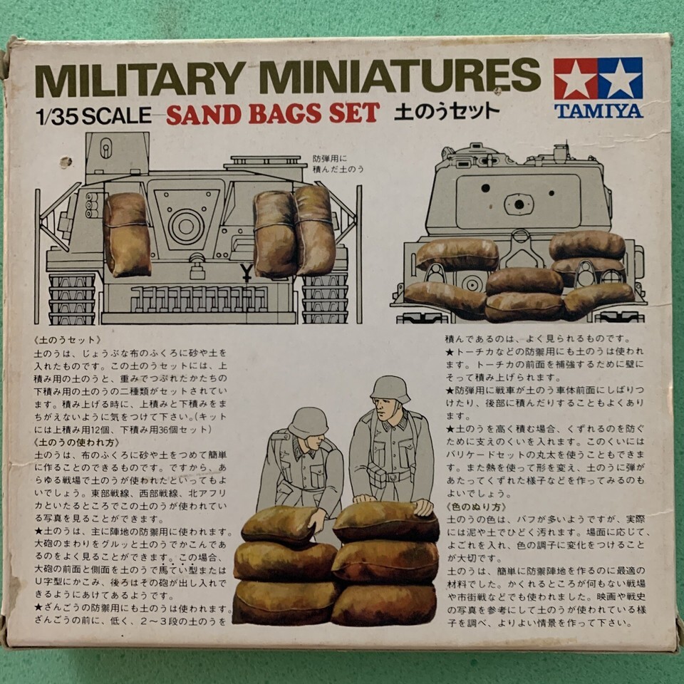 Enhance your collection with this sealed-in-box 1/35 Tamiya Sand Bag Set Plastic Model Kit. This kit is perfect for creating military miniatures and is made of high-quality plastic material. The set includes everything you need to build a detailed and realistic sandbag, including a 1:35 scale and featured refinements from Tamiya.