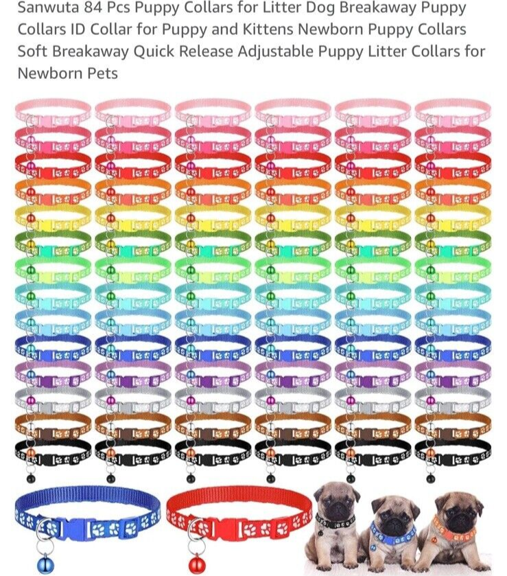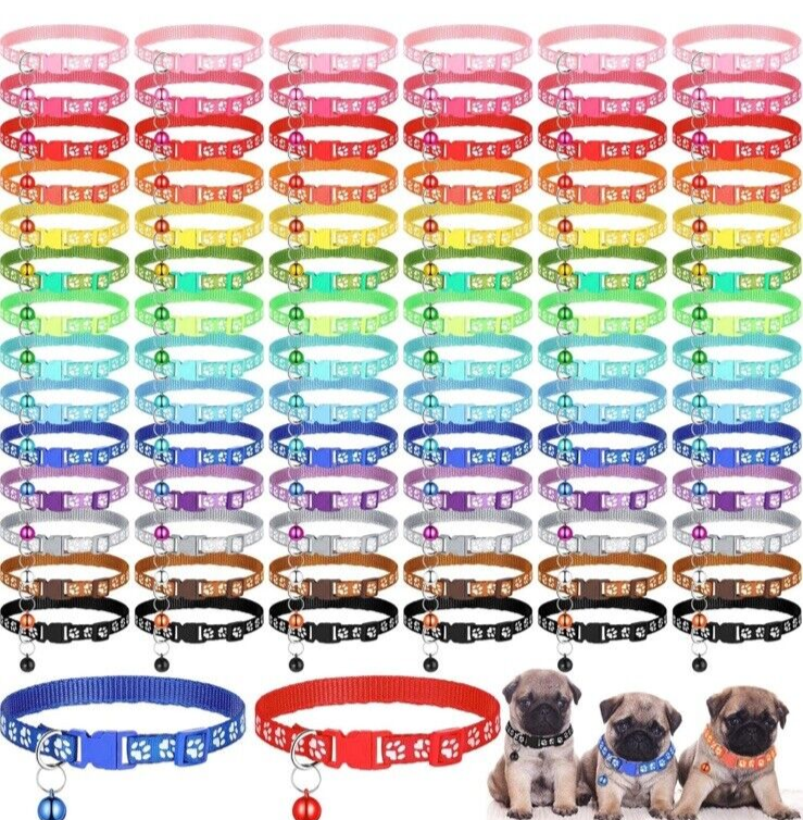 Add some flair to your furry friend's outfit with this set of 64 colourful nylon collars. These collars are perfect for puppies and kittens of all sizes and breeds. The collars are adjustable and feature snap buckles for easy attachment.