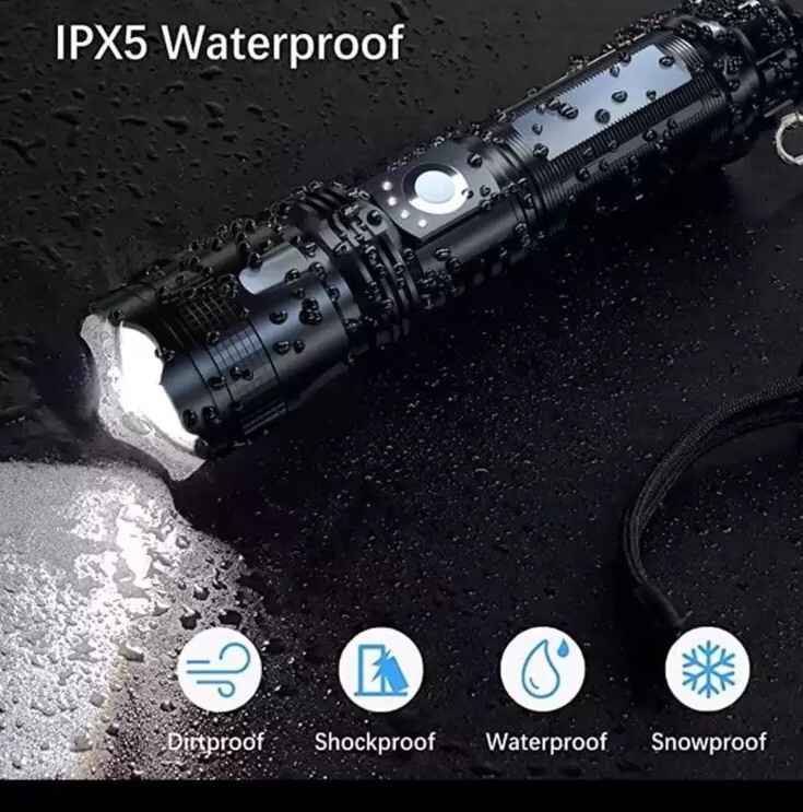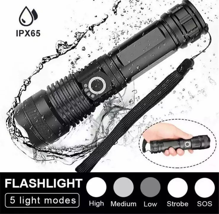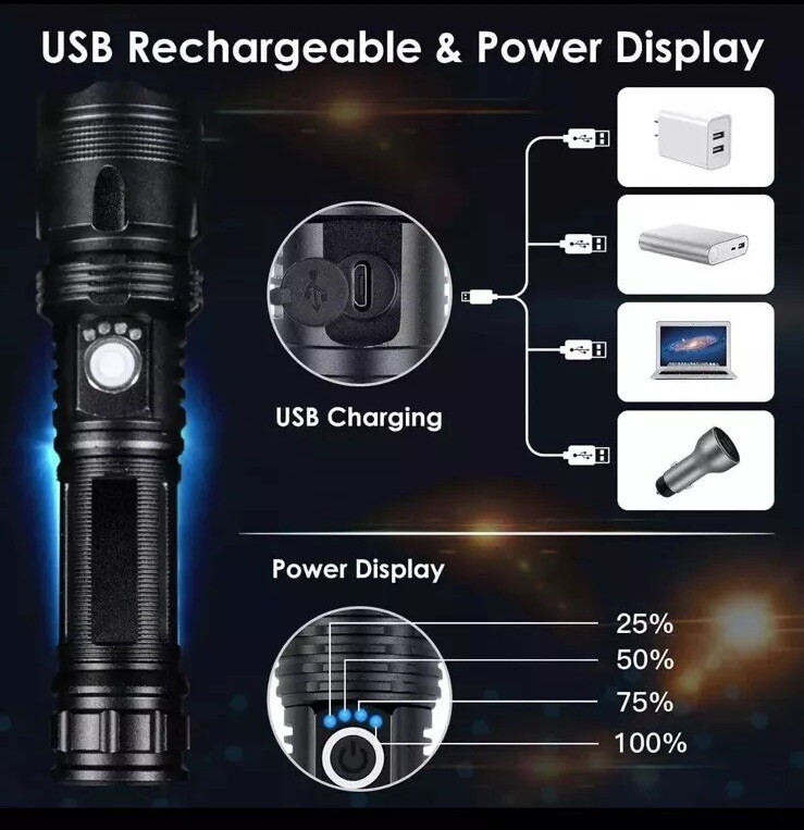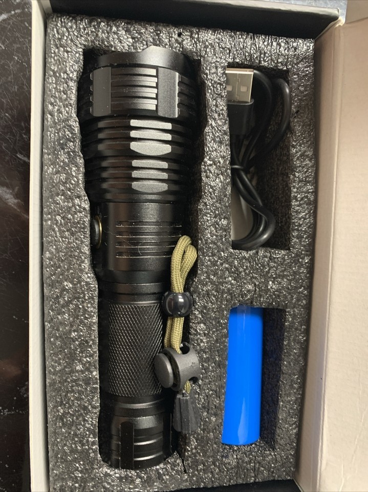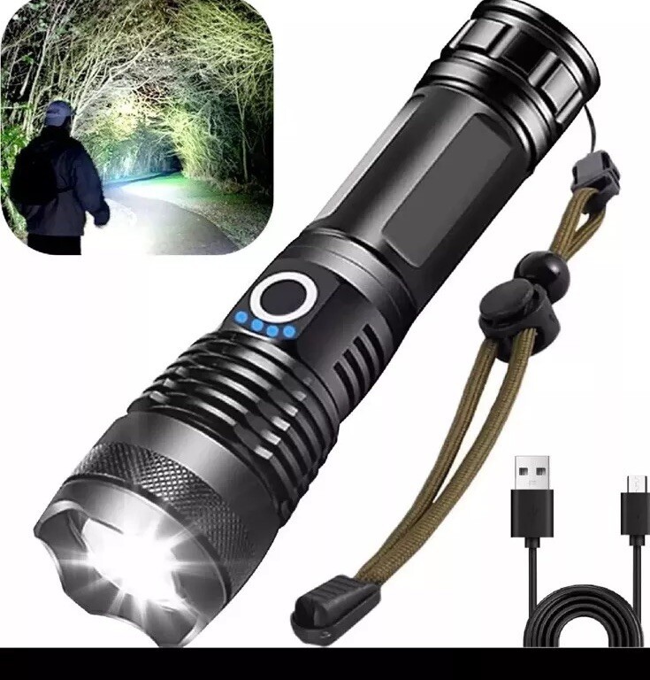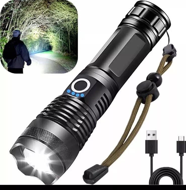 This USB-rechargeable flashlight is perfect for all your camping and hiking needs. With a powerful 100000 lumens, you'll be able to light up any dark area with ease. Its waterproof design makes it durable and long-lasting, while its lightweight design makes it easy to carry around. The flashlight is colored in sleek black and comes with a 26650 battery size.