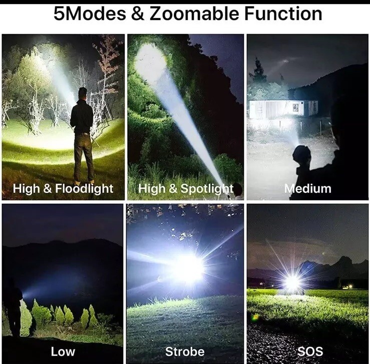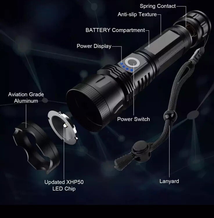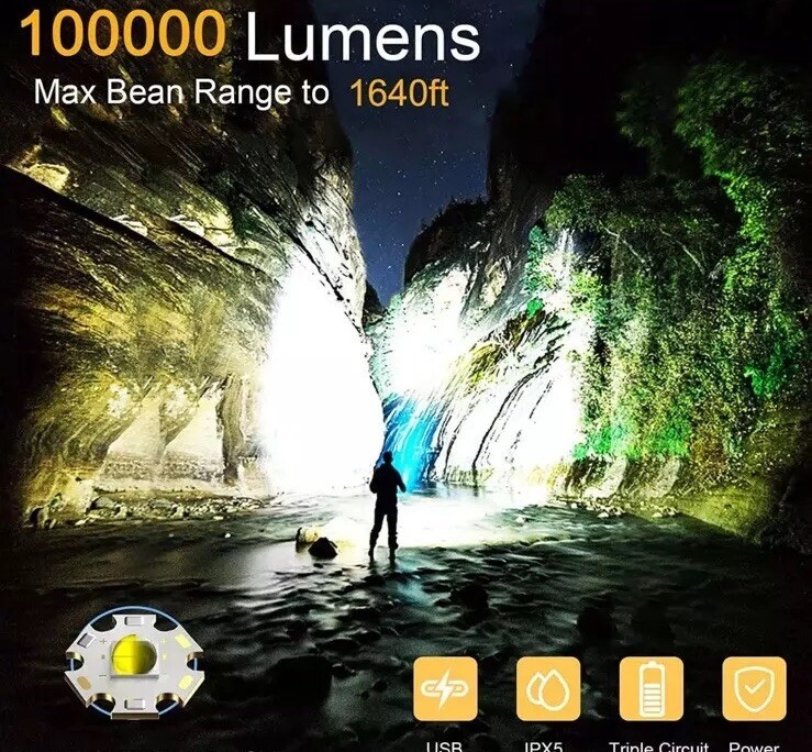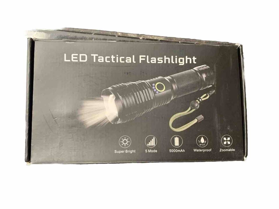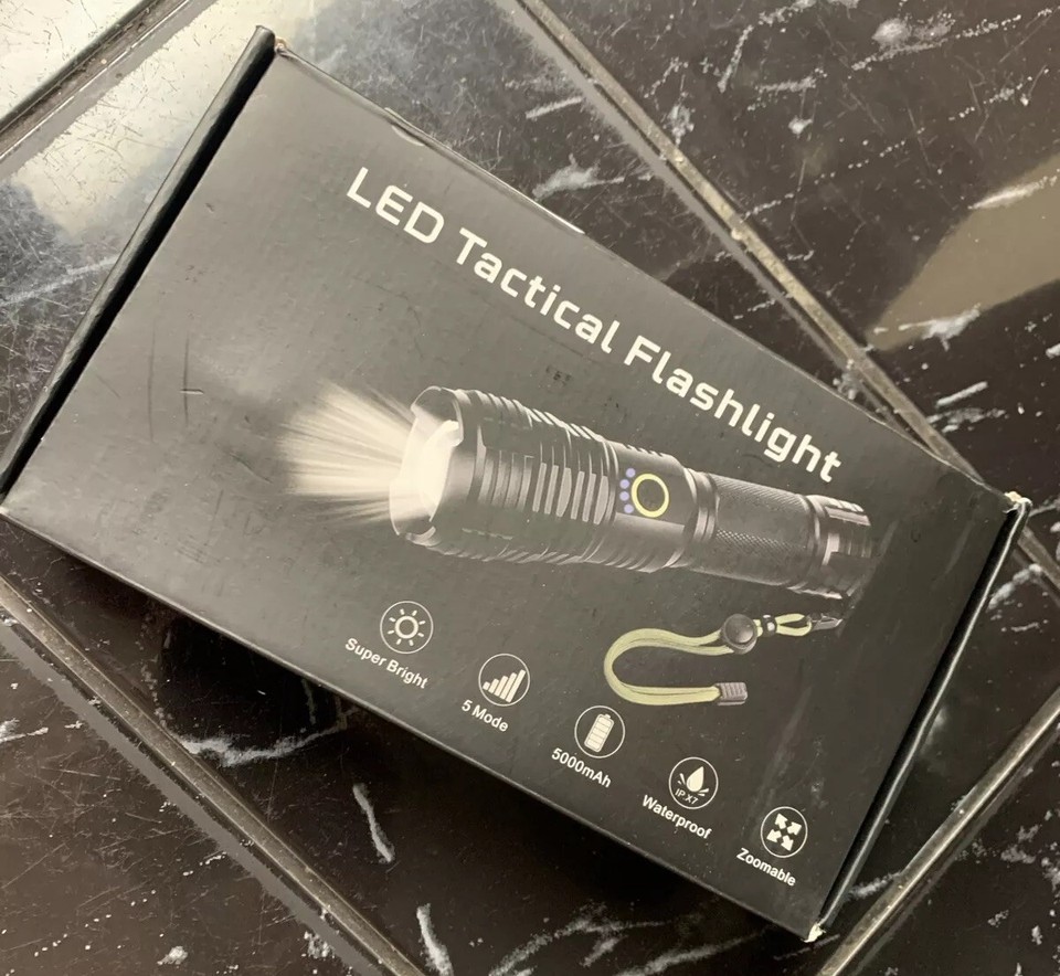 This USB-rechargeable flashlight is perfect for all your camping and hiking needs. With a powerful 100000 lumens, you'll be able to light up any dark area with ease. Its waterproof design makes it durable and long-lasting, while its lightweight design makes it easy to carry around. The flashlight is colored in sleek black and comes with a 26650 battery size.