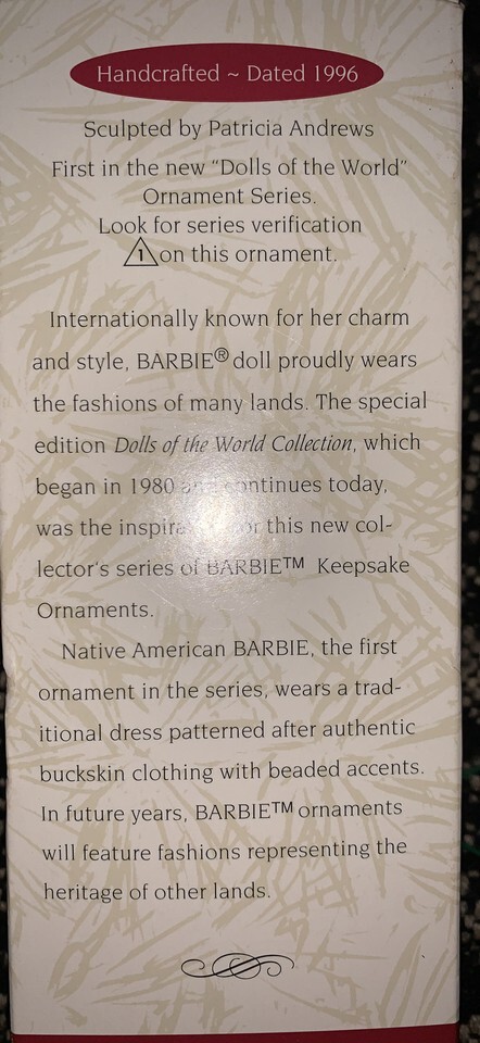 1996 Hallmark Keepsake Ornament Native American Barbie Dolls Of The World #1