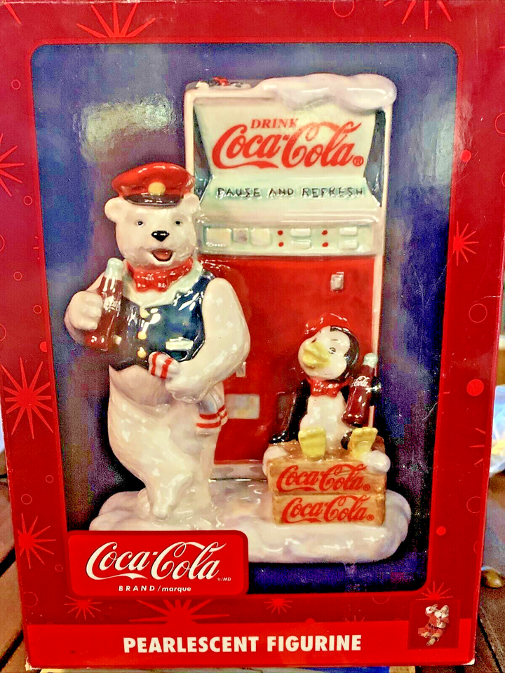 This Coca-Cola figurine features a cute Polar Bear and Penguin standing in front of a Coke machine. It is a pearlescent figurine made in China and is an original collectible item. The brand is Coca-Cola, a well-known soda brand that has been around for many years.