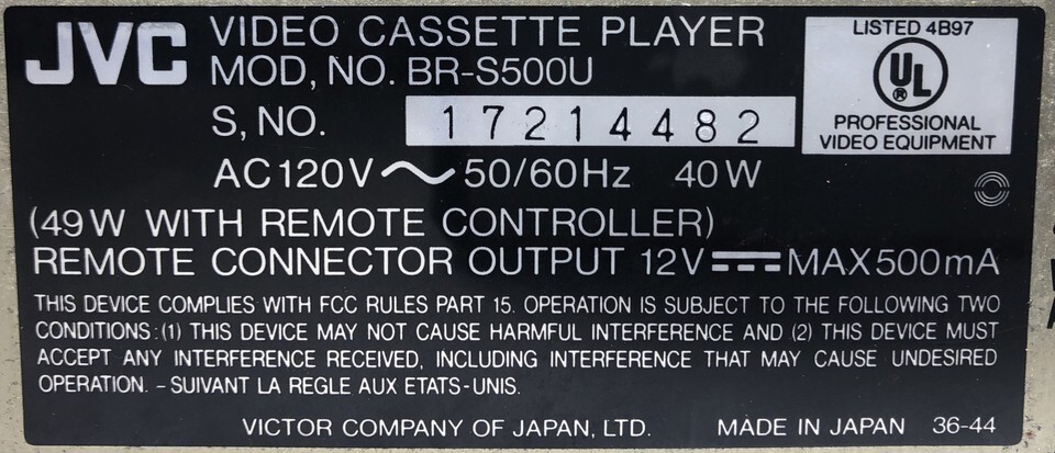 JVC Model BR-S500U Super VCR Player Editing Deck