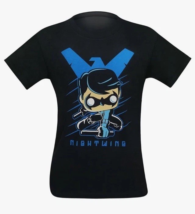 The Funko Pop Nightwing T Shirt in 2XL size is a limited edition unisex black tee featuring the character Nightwing from DC Comics. This graphic tee has a round neckline and short sleeves, made of 100% cotton material. The shirt showcases the iconic blue Nightwing color and is part of the Funko Pop Tees product line. Perfect for casual occasions, this athletic fit shirt is a must-have for fans of Batman and Nightwing, blending elements of animation and pop culture in its design.poo pop pub