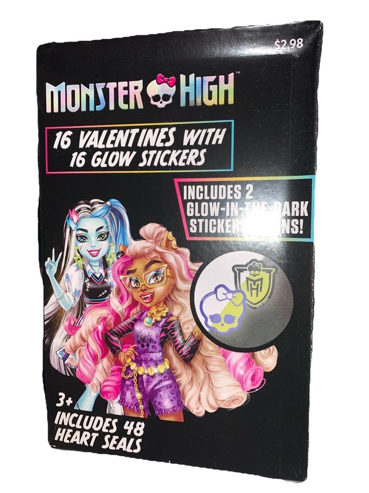 The product is a set of 16 Monster High Valentine Exchange Cards featuring popular characters such as Lagoona Blue, Frankie Stein, and Draculaura. Each card has slots for glow-in-the-dark stickers, and includes a total of 48 heart seals. Designed for ages 3 and up, there are 8 different card designs in the set, making it a fun and colorful way to celebrate Valentine's Day with a Monster High theme. The multicolor cards are sure to delight recipients and add a touch of whimsy to the occasion.