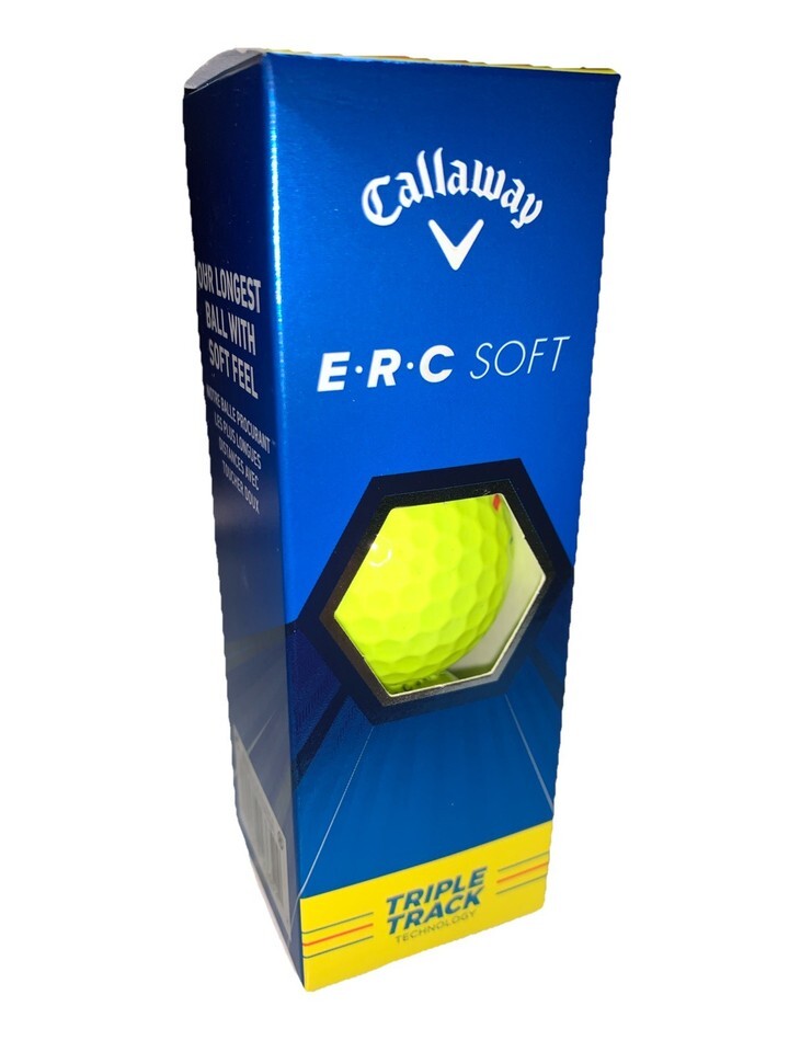 The Callaway ERC Soft Triple Track Golf Balls in Yellow are designed for golfers seeking improved control, distance, and short game performance. With a soft feel and triple track technology, these tour-preferred balls offer a balance of comfort and precision on the course. Suitable for practice green use, each sleeve contains 3 balls, making them ideal for golf enthusiasts looking to up their game with high-quality equipment from a trusted brand like Callaway.