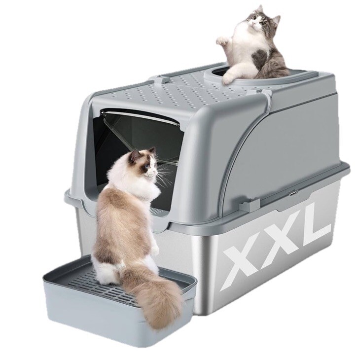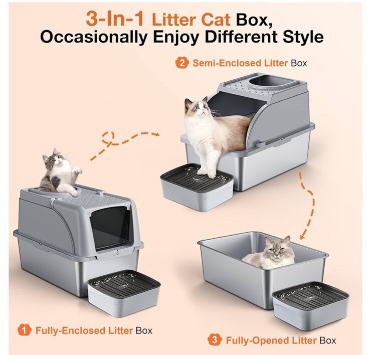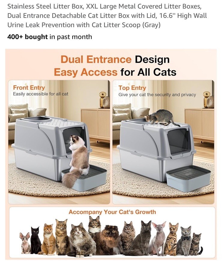 Stainless Steel Litter Box, XXL Large Metal Covered Litter Boxes, Dual Entran...