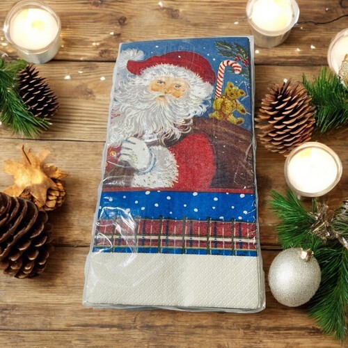 Get into the festive spirit with these vintage party house napkins featuring Santa Claus with a teddy bear holding a candy cane! Made in the United States, these 3-ply napkins are perfect for adding a touch of holiday cheer to your dining table. Use them to wrap around your favorite dishes or as a decorative accent in your home. These napkins are a must-have for any collector of Christmas decor and are sure to bring joy to your guests.