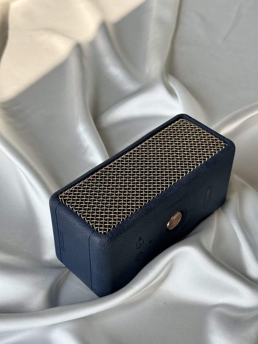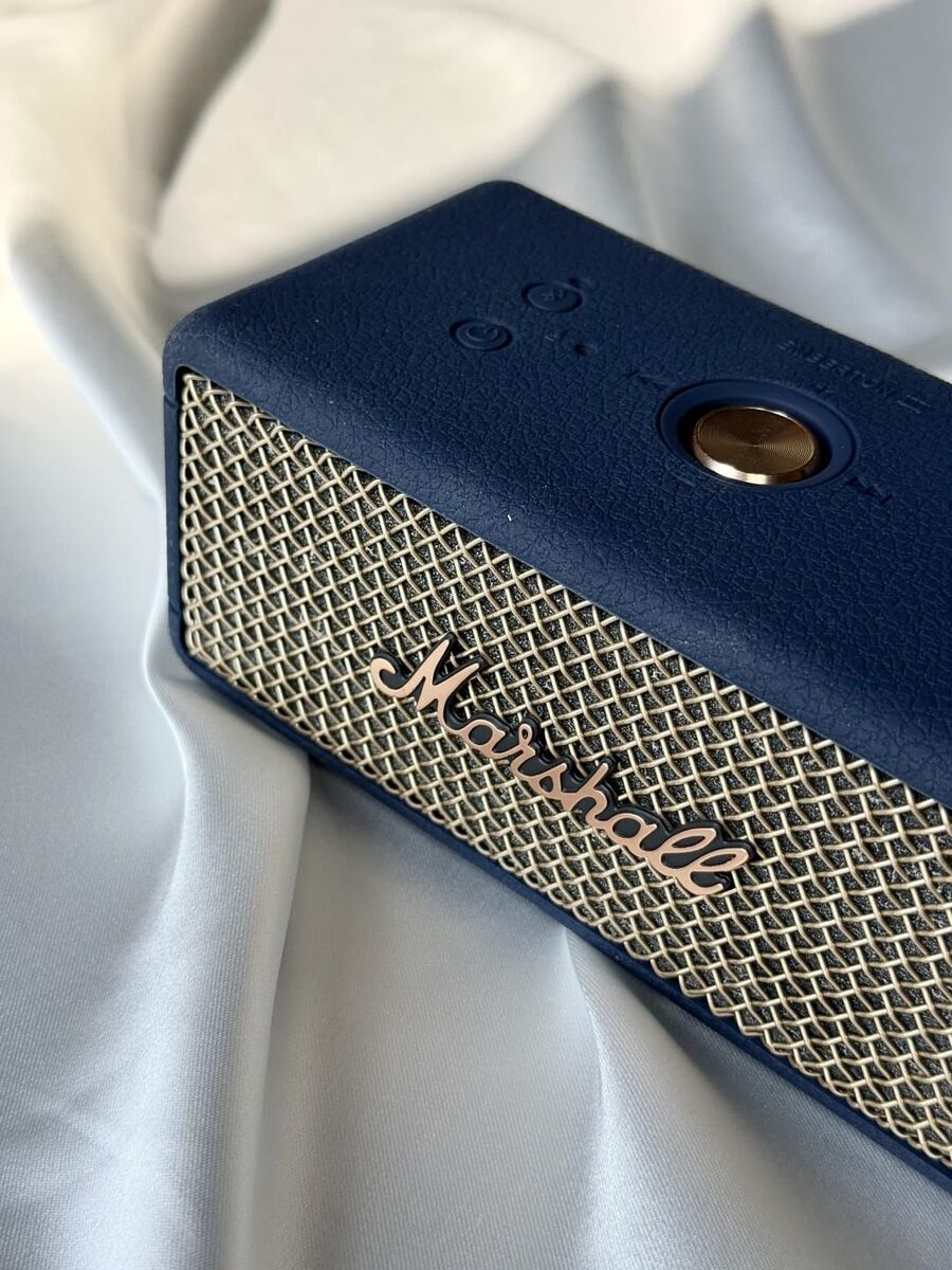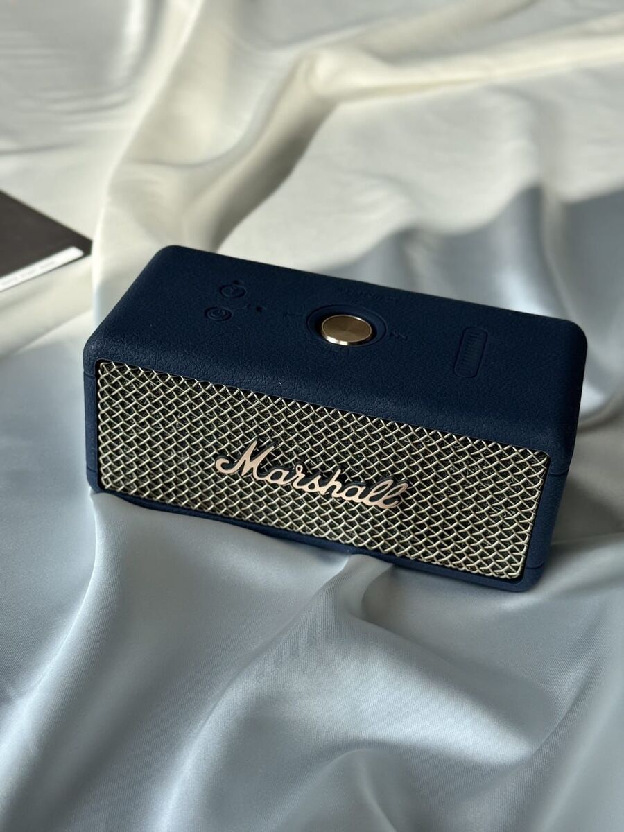 This Marshall Bluetooth speaker features a stylish blue casing. Includes original box, instruction manual, and USB charger.