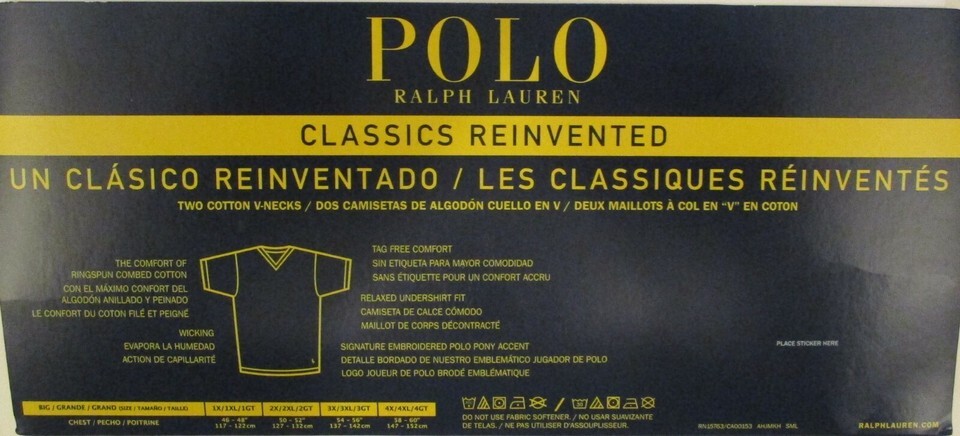 2-Pack of Authentic Polo Ralph Lauren White V-Neck T-Shirts "The Supreme Comfort of 100% Ringspun Combed Cotton" Choice or Color: White, Black. Choice of sizes: 1XL Big, 2XL Big, 3XL Big, 4XL Big, 1XL Tall, 2XL Tall, 3XL Tall, 4XL Tall Signature Polo Player at bottom hem. 100% ringspun combed cotton. Classic style. Relaxed fit. V-neck Tee. Smooth and tagless neckline for comfort. Size Chart Chest Size 1XL 2XL 3XL 4XL 5XL Inches 46-48 50-52 54-56 58-60 62-64 CM 117-122 127-132 137-142 147-152 157-162 International shipments will be marked for customs as merchandise. These charges are the buyer's responsibility. Please check with your country's customs office to determine what these additional costs will be prior to bidding or buying.