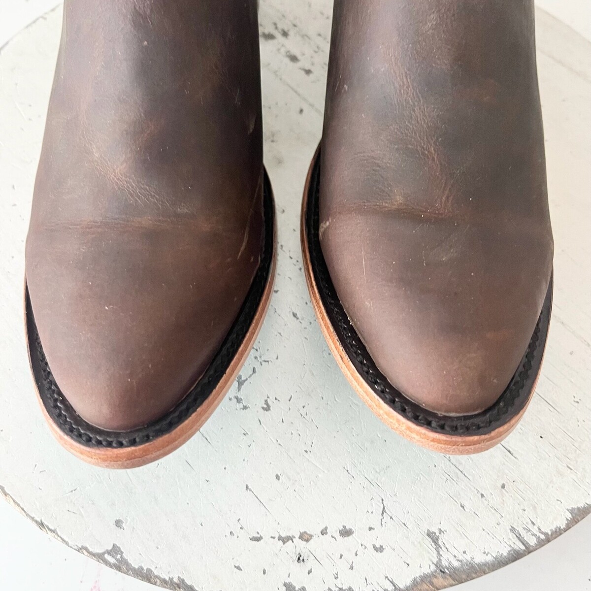 Condition: These are new shoes. There is some rough stitching on the heel. The leather is distressed by design, however, there is more distressing than normal. They fit true to size and will come with a Boot box.
