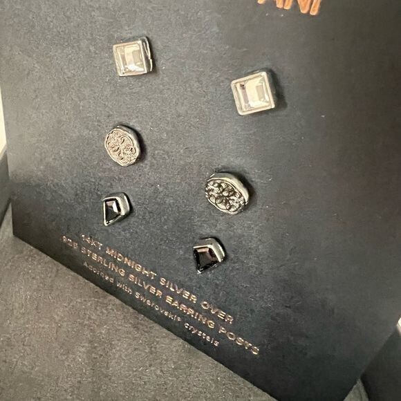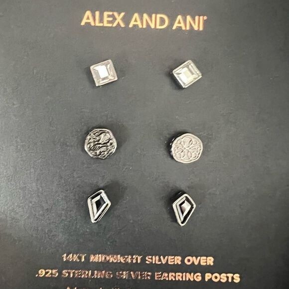 ALEX AND ANI Swarovski Jet Path Of Life Stud Earring Set Color: Silver NEW WITH TAGS ATTACHED IN GIFT BOX Mix and match with this three-piece set of Path of Life, square and kite crystal stud earrings. Set of 3 Path of Life Studs: 0.32" W; Square Crystal Studs: 0.21" W; Kite Crystal Studs: 0.30" W Post back 14k midnight silver over .925 sterling silver, swarovski crystal Imported