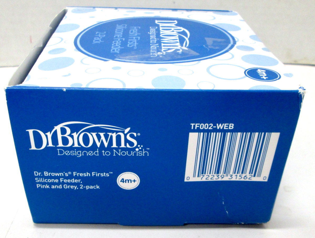New in the Open/Damaged Box Dr.Brown's Designed To Nourish Fresh First Silicone Feeder 2 Pack in Pink Grey. The box is opened and damaged but the pacifiers are still sealed in plastic. Sold with free shipping.