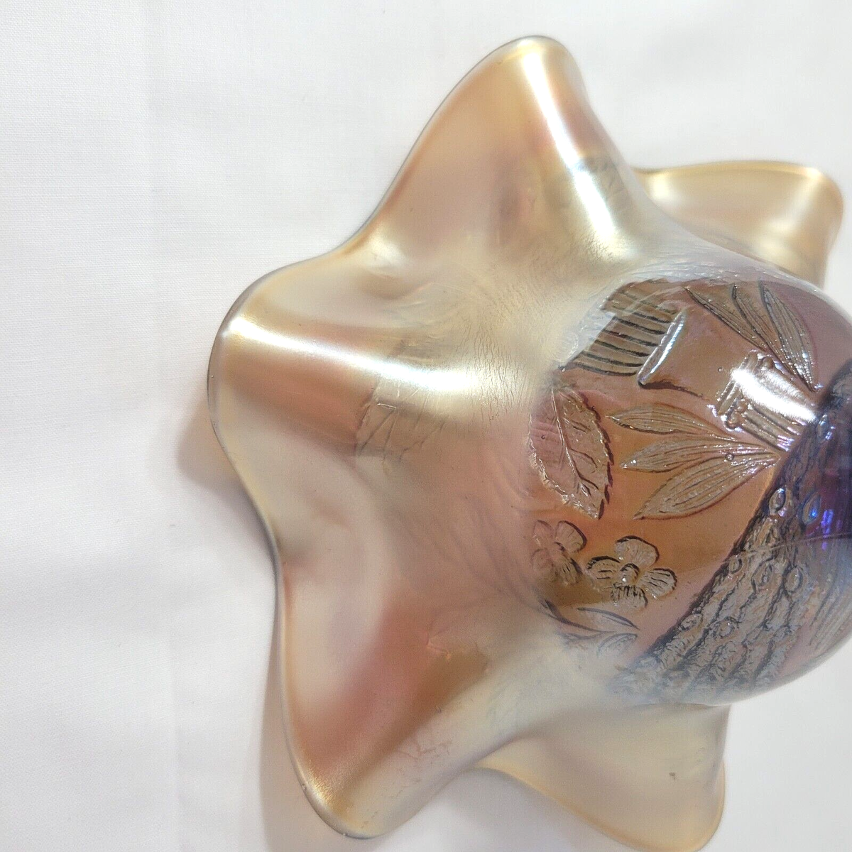Lovely Fenton Peacock and Urn Carnival Glass Compote / Candy Dish