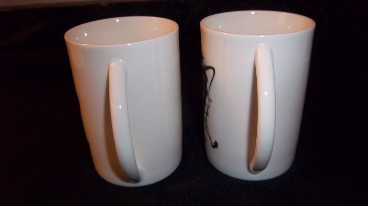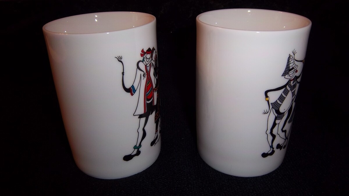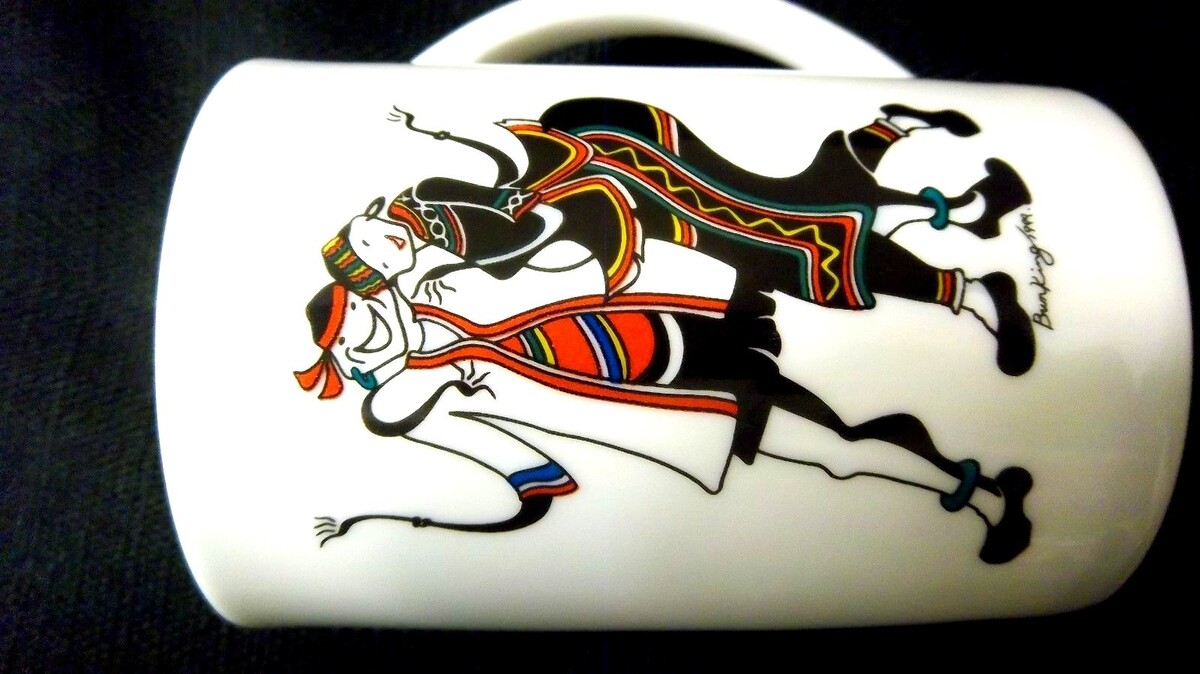 Charming pair of mugs, designed to feature the Bunun and Yami People of Taiwanese Aboriginal -- Colorful and Unique! Each is 4-1/4" high, 2-3/4" wide. No chips, please note a mfr blem on surface of one mug, as shown in last photo. ~PLEASE VIEW ALL PHOTOS AS THEY ARE PART OF THE DESCRIPTION~