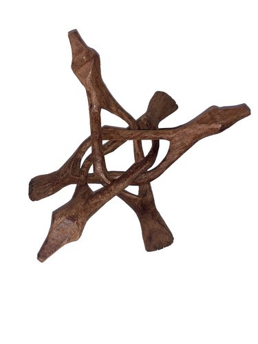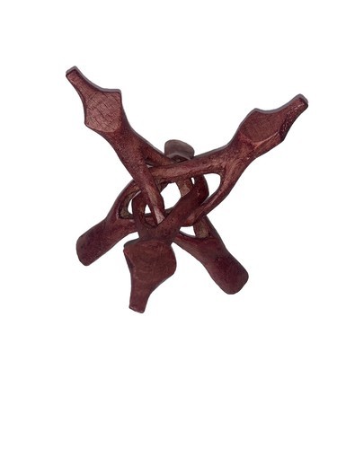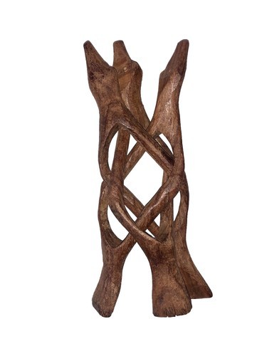 This lot of 3 vintage hand-carved wood tripod 3-legged stand animal head figurines stands at 3.75 inches tall when opened. Each piece is intricately carved from brown wood, featuring unique animal head designs on 2 of them. These retro style sculptures are a perfect addition to any collection, suitable for all occasions and appealing to a wide range of age groups. Made in the 1980s, these original carvings showcase the artistry and craftsmanship of hand-carved wood sculptures from that era.
