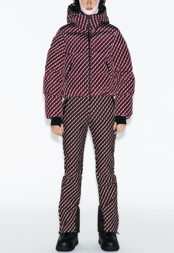 High-waisted with adjustable side tabs with snap buttons. Front zip pockets. Adjustable FLARE leg with zip and a longer back hem than the front to accommodate ski boots. Hem finished with a technical fabric patch to prevent chafing caused by ski and snowboard equipment. Elastic inner cuff with an adhesive strip and snap buttons to secure footwear and prevent snow and cold from entering. Secure front fastening with zip and technical sliding button.