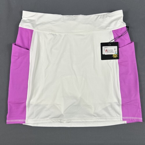 This pull on stretch knit skort has 2 front zip pockets and 2 back flap pockets. The Super Soft knit stretch fabric is 88% Polyester and 12% Spandex blend.