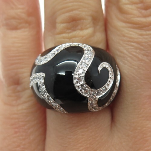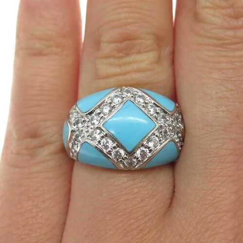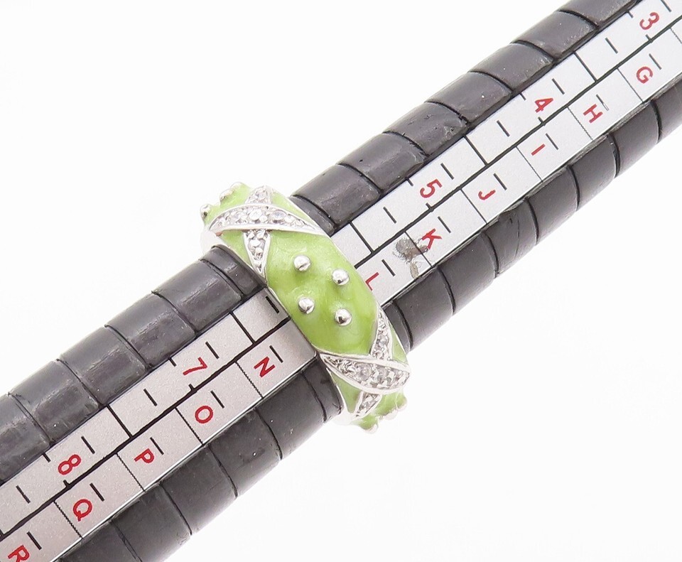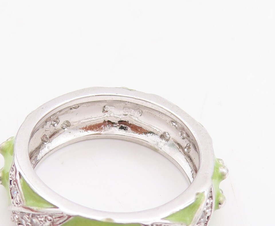 925 Sterling Silver Vintage Ring Designer Green Enameled CZ Inlay Sz 6 RG29057
