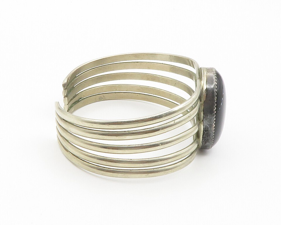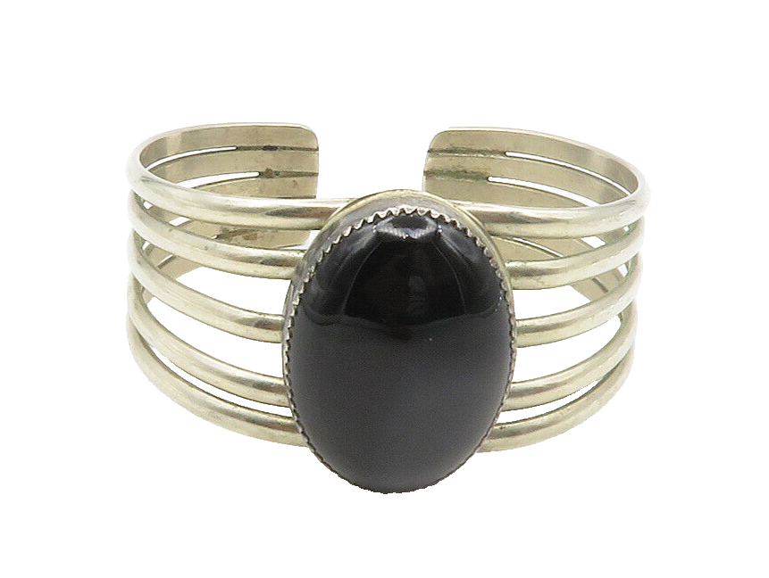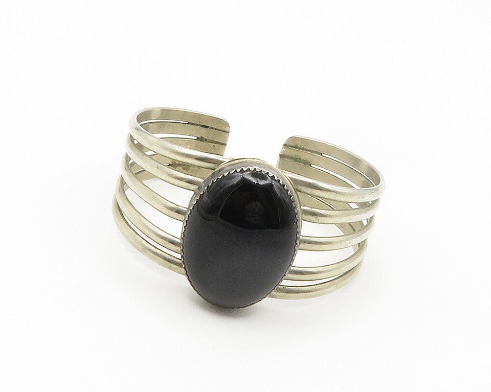 NAVAJO 925 Silver Vintage Cabochon Black Onyx Split Cuff Bracelet BT5695