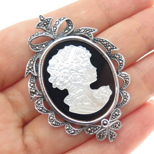 925 Sterling Silver Vintage Antique Marcasite Accent Cameo Brooch Pin BP7913